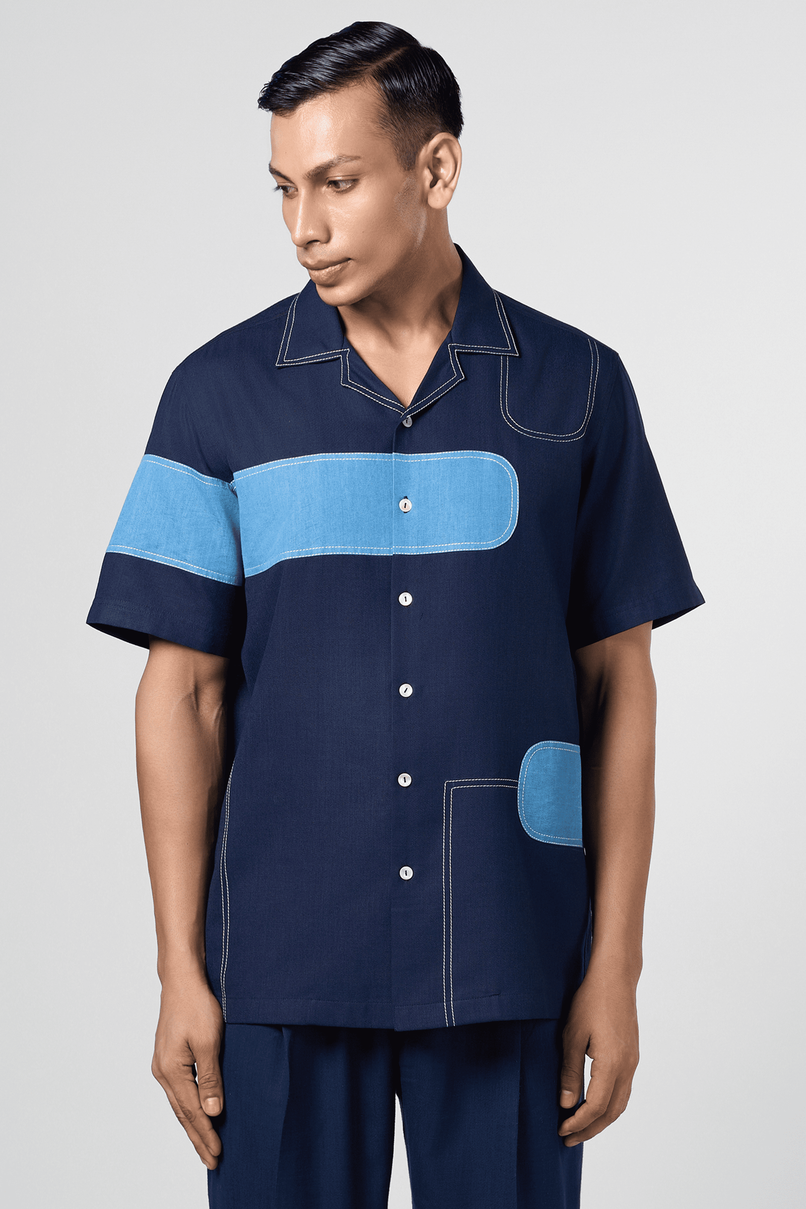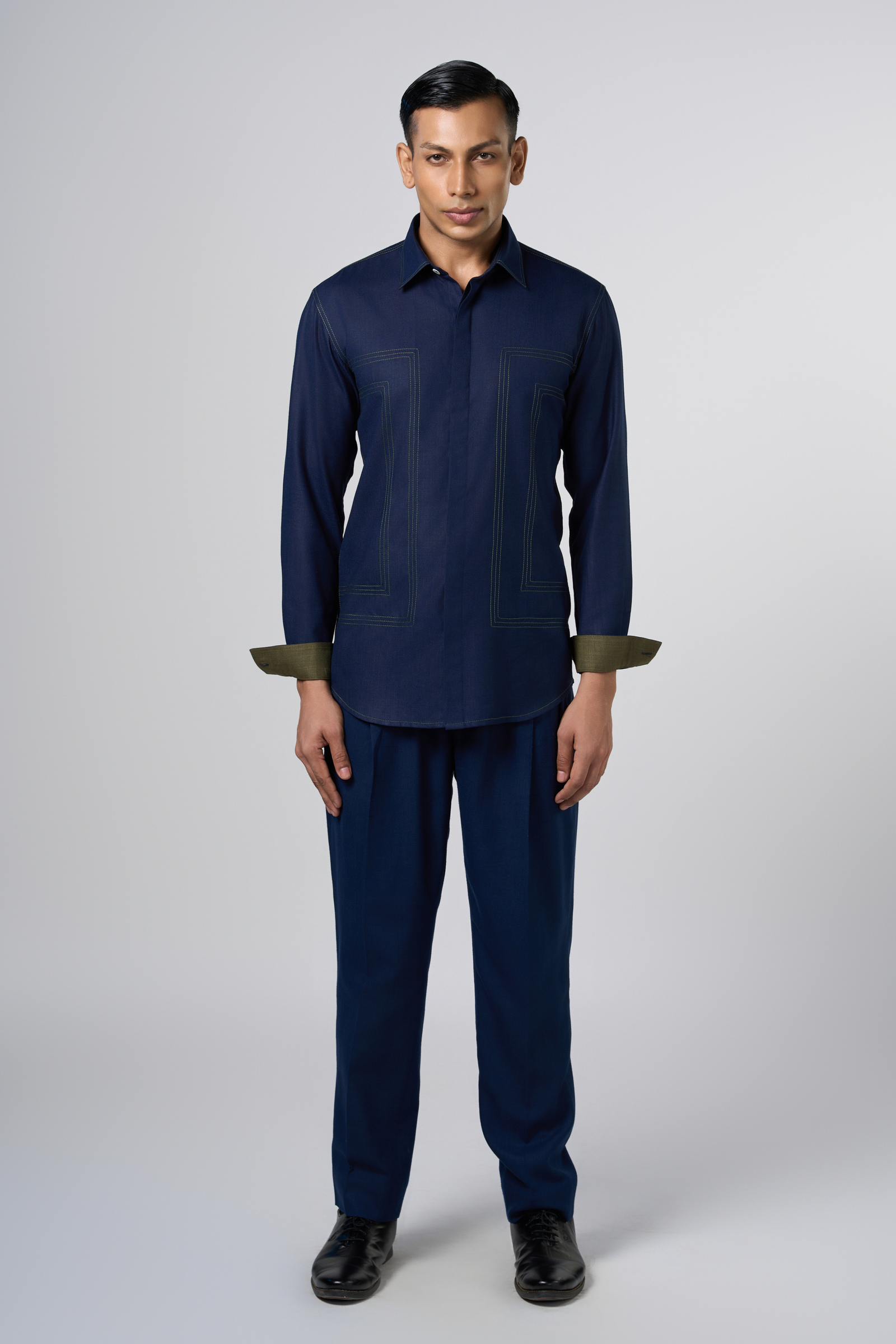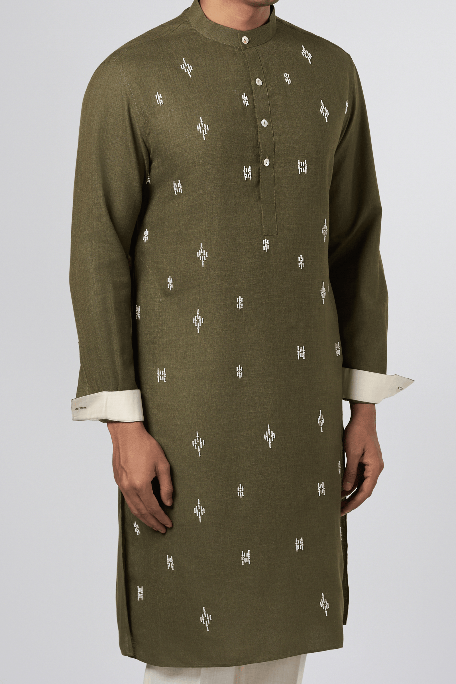 • Off white straps with olive green stitch line detail stitched upon olive green full sleeved button down shirt