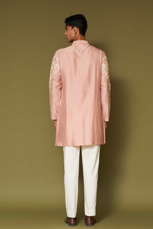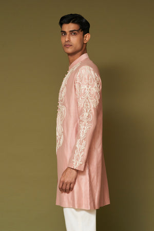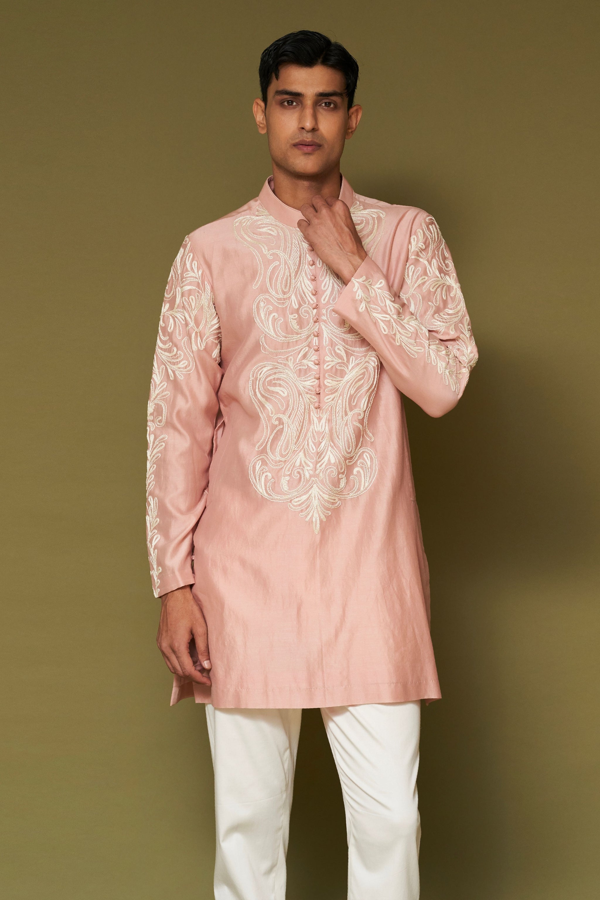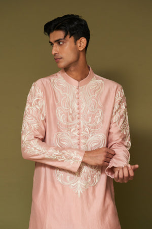 • This elegant blush pink ensemble features a chanderi kurta intricately detailed with dori embroidery, showcasing fine craftsmanship. The front is accentuated with delicate potli buttons, adding a touch of traditional charm. Paired with matching slim pants, it embodies a seamless blend of heritage and modernity.