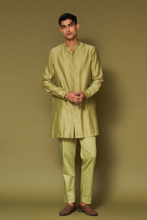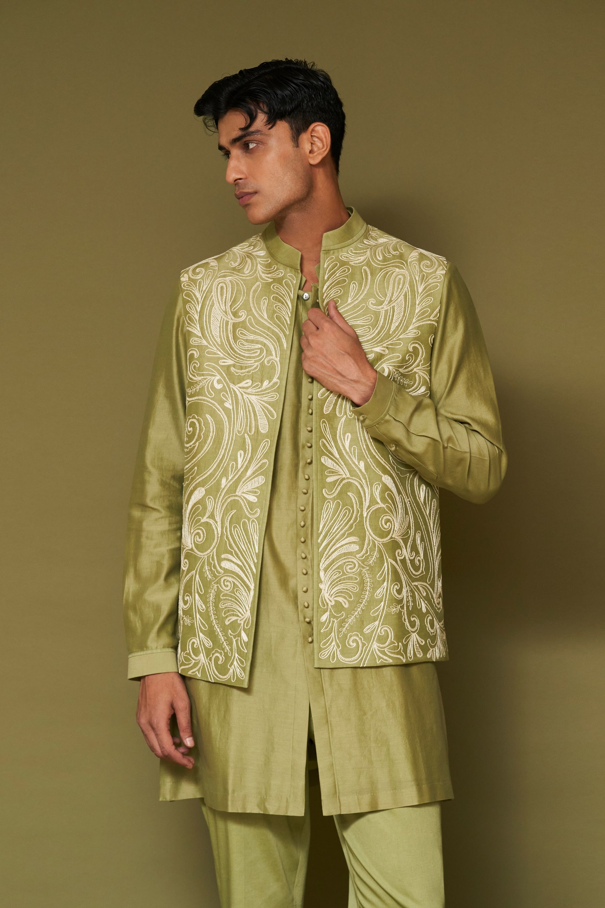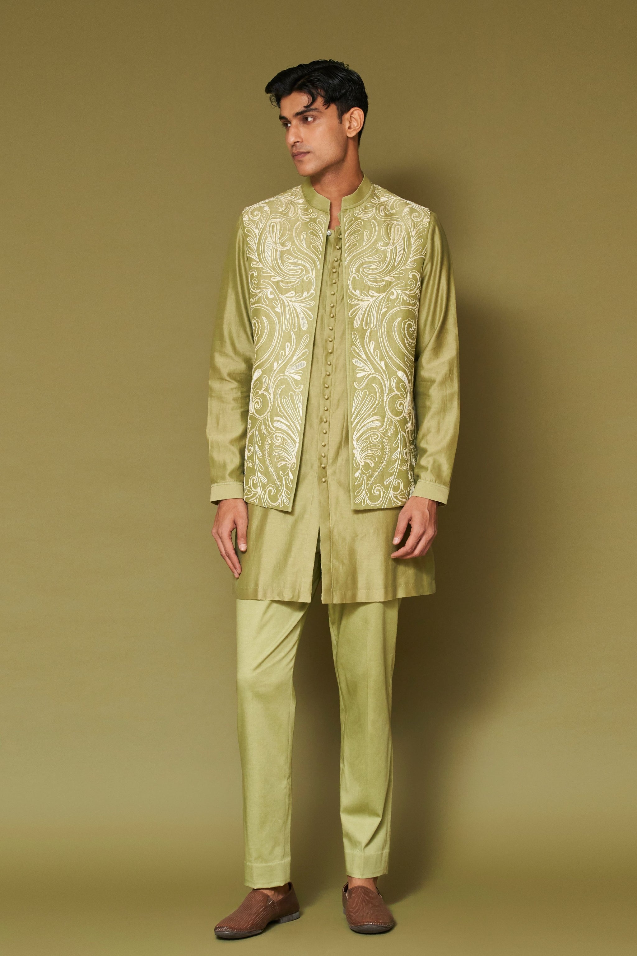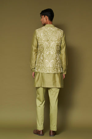 • This pistachio bundi set features a linen satin bundi adorned with intricate dori jaal embroidery, adding structured elegance to the look. It is layered over a silk chanderi kurta finished with delicate potli buttons, and paired with matching slim pants. A balanced play of texture and detail makes it ideal for modern occasion dressing.