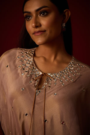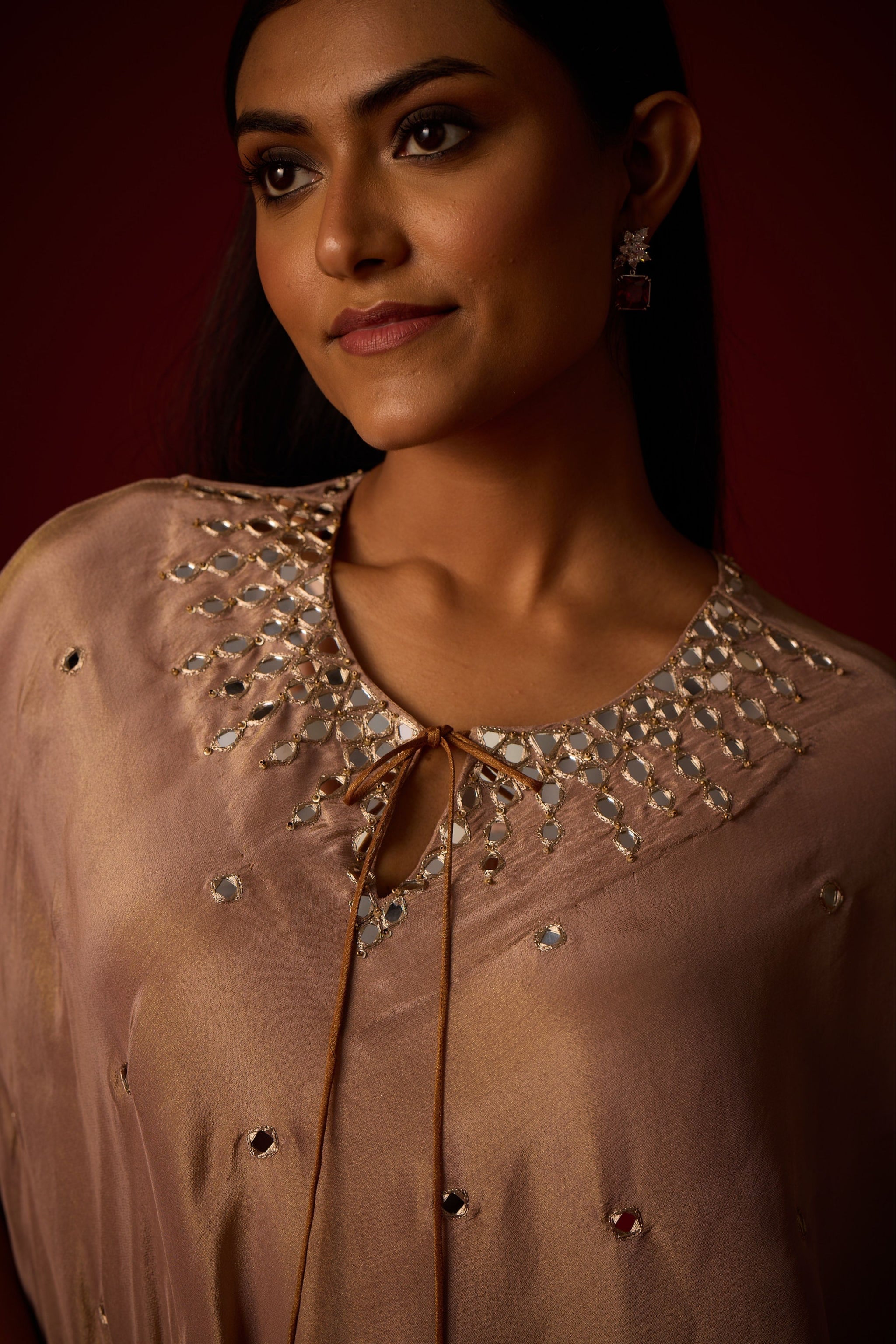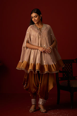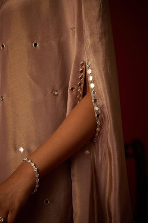 • Tissue round cape with hand embroidered mirror work in zari, enhanced with beadwork and tassel details