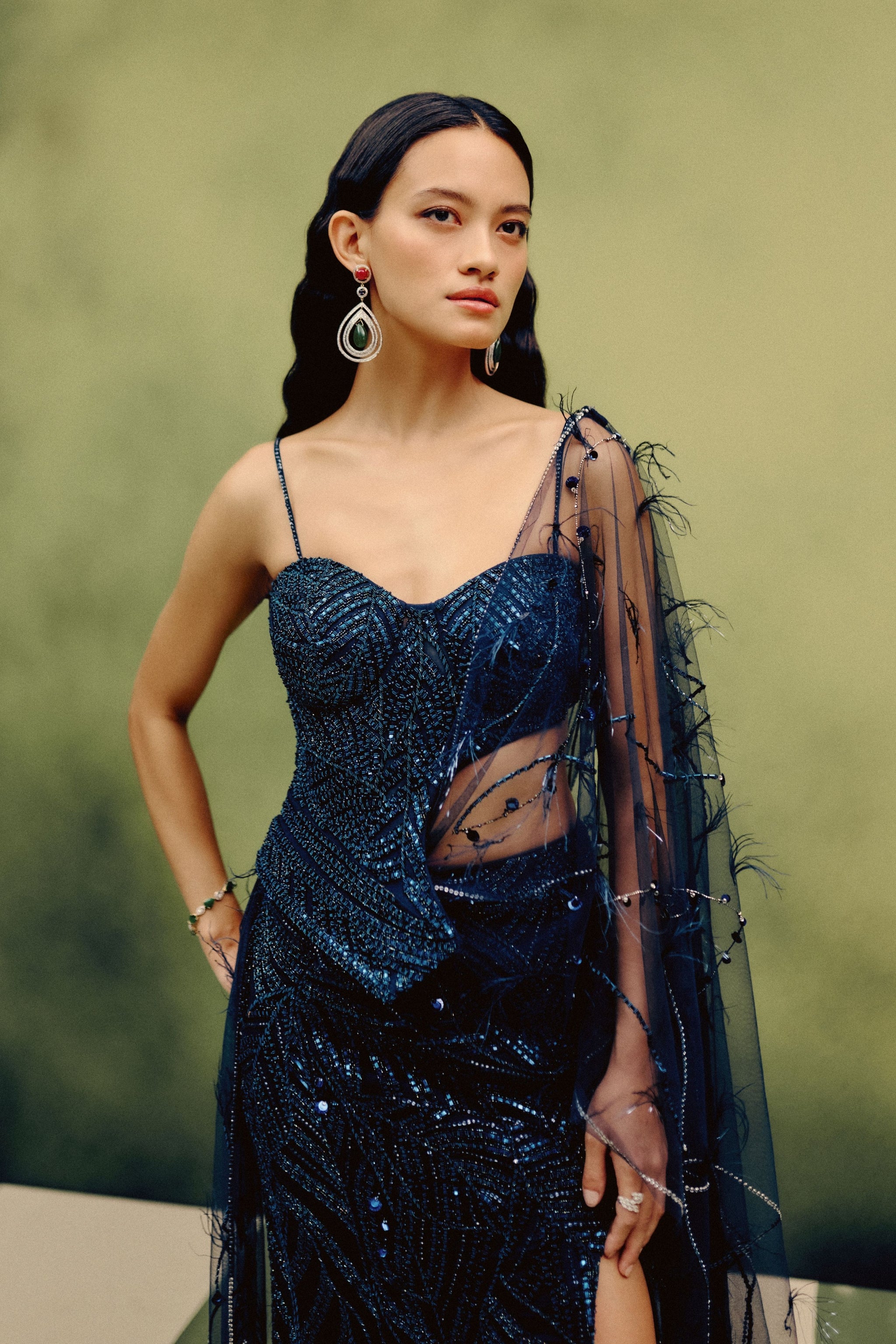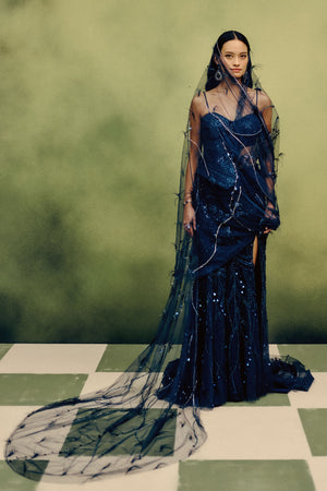 • In a striking neon navy hue, this corset and skirt set is elevated through intricate monochromatic hand embroidery, radiating contemporary grandeur. A feather-accented dupatta drape flows with sculptural grace, its artistry illuminated by exquisite handwork and jewel-like precision.