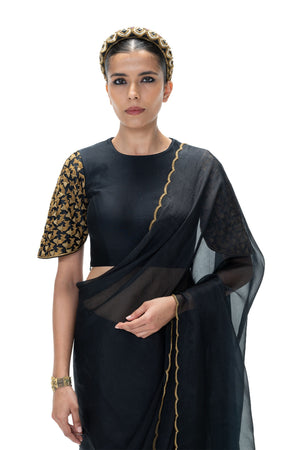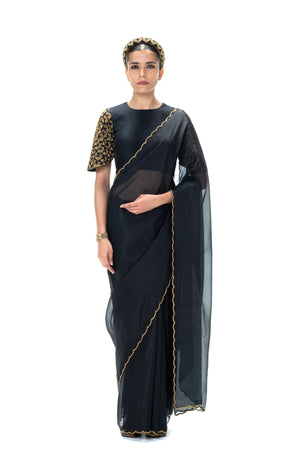 • Amara saree is a striking ensemble featuring a handwoven, intricately embroidered organza silk saree with an unstitched blouse fabric. Draped in classic black, this saree exudes timeless elegance, making it perfect for festive occasions, evening events, and special celebrations.