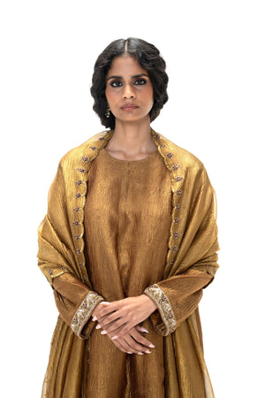 • Rupa kurta set is a stunning three-piece ensemble featuring a handwoven, intricately embroidered crushed tissue kurta paired with matching pants and a dupatta. Rendered in a sophisticated blend of old gold and cinnamon, this set radiates elegance and festive charm, making it perfect for celebrations, gatherings, and special occasions.