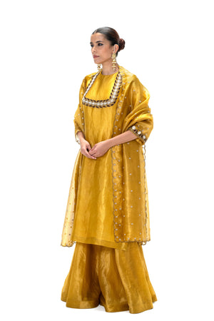 • Sevanti kurta set is a vibrant three-piece ensemble featuring a handwoven, intricately embroidered tissue silk kurta paired with matching pants and a dupatta. Draped in a rich mustard hue, this set radiates elegance and festive charm, making it perfect for celebrations, gatherings, and special occasions.