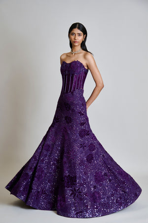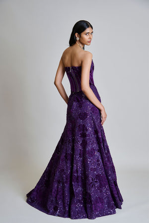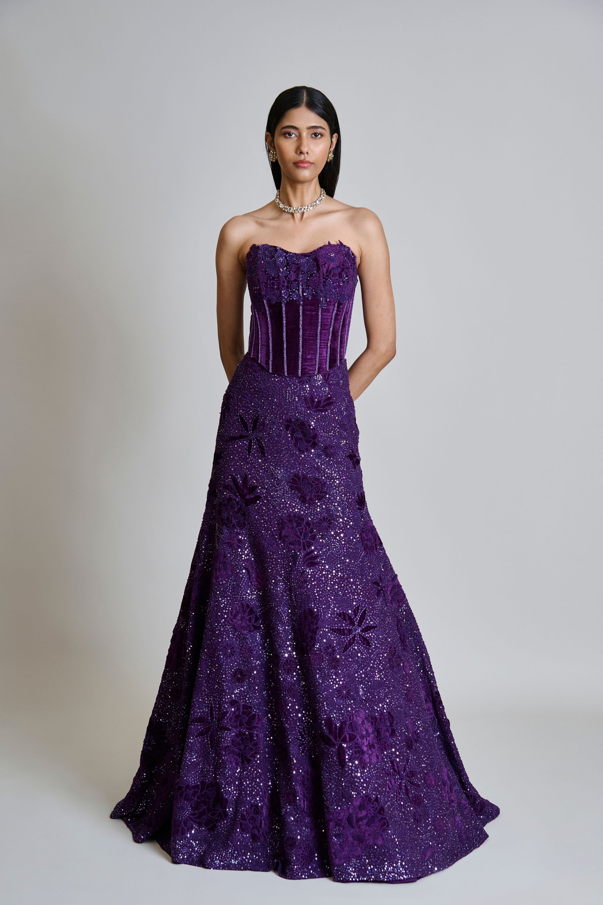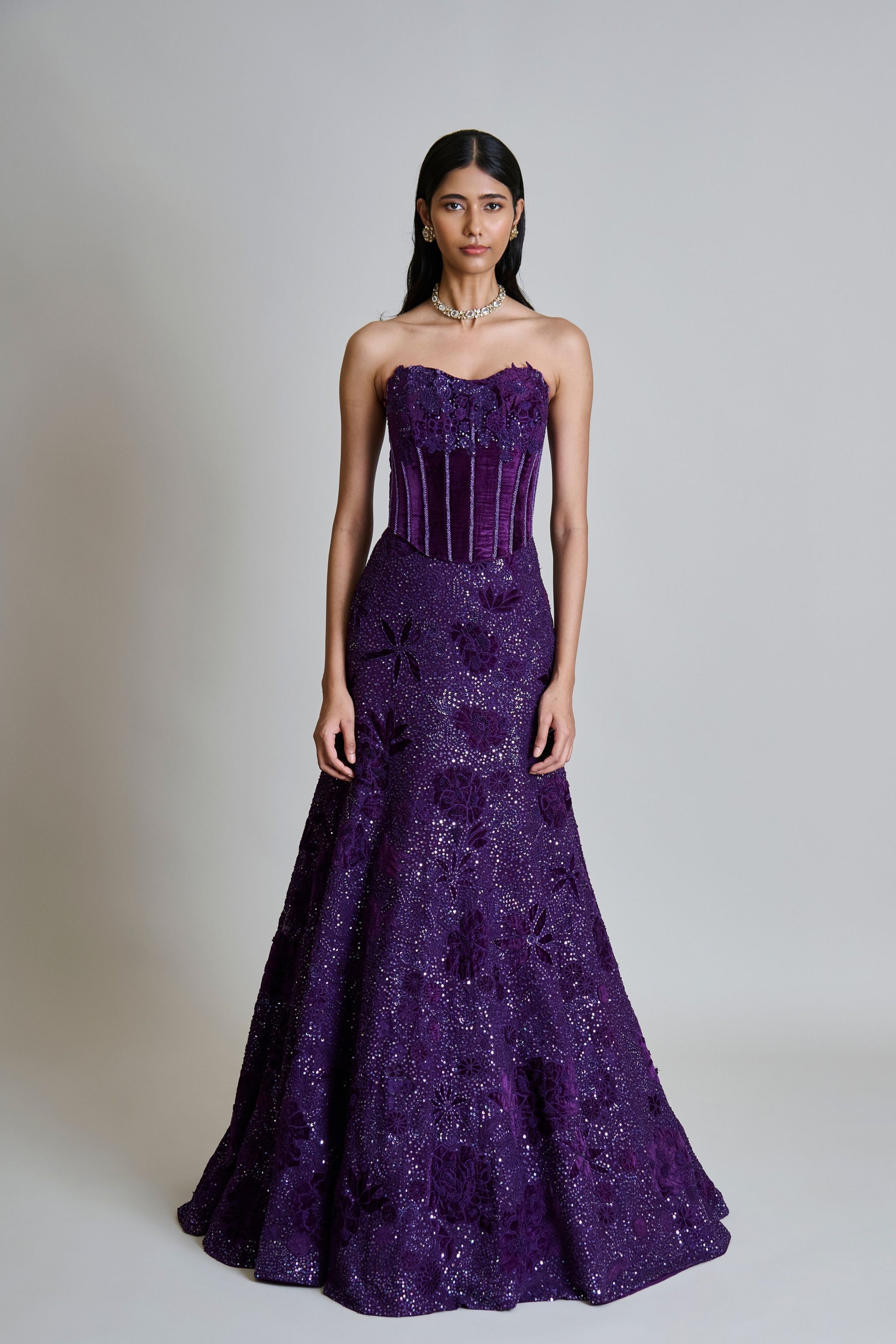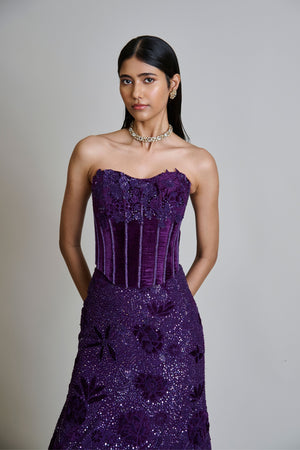 • Tonal velvet appliqued lehenga with mirror and sequin bling paired with a velvet applique corset