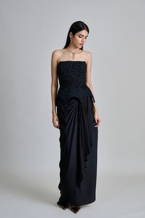 • Tonal smocking peplum corset with wildflower applique and draped skirt.