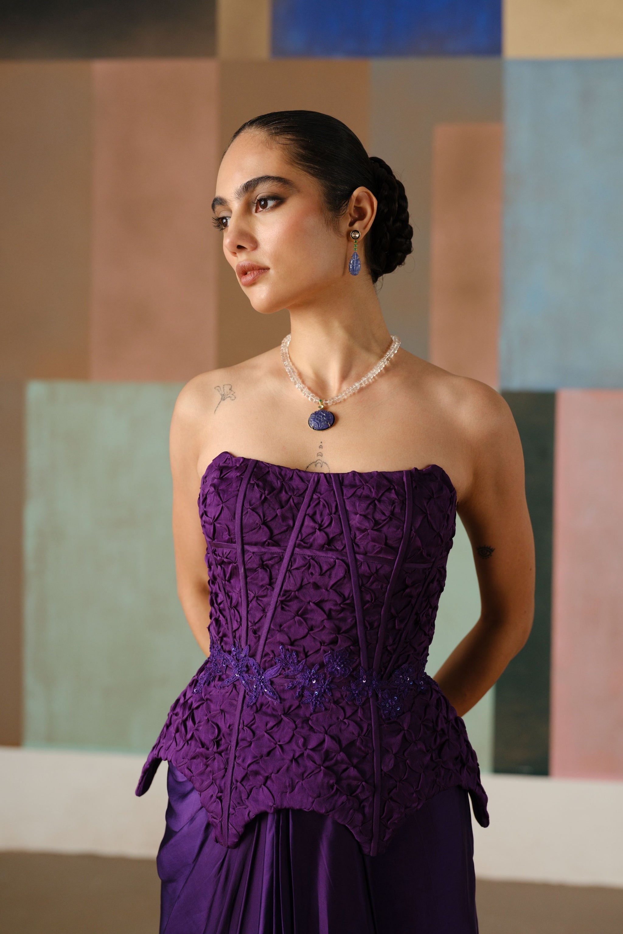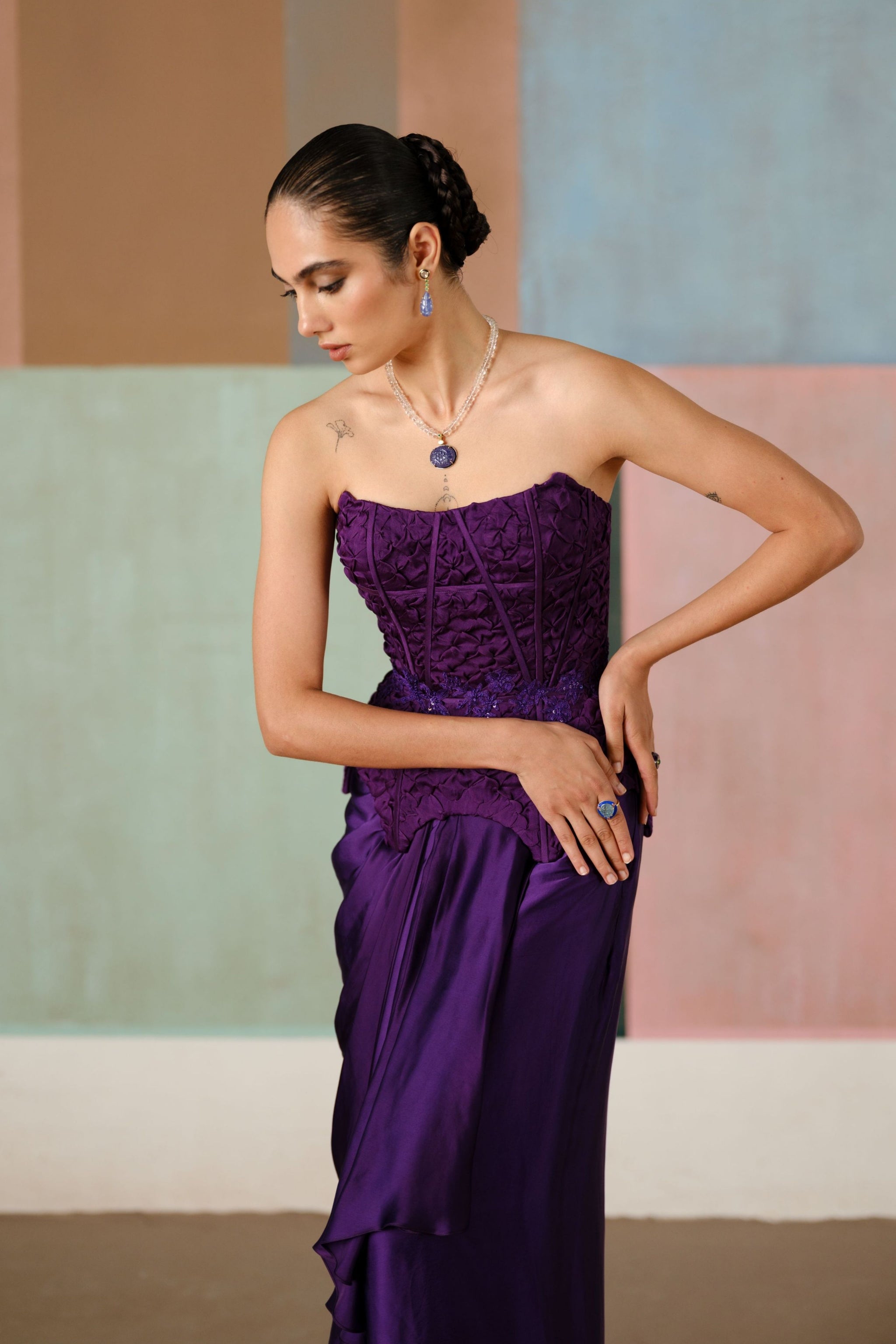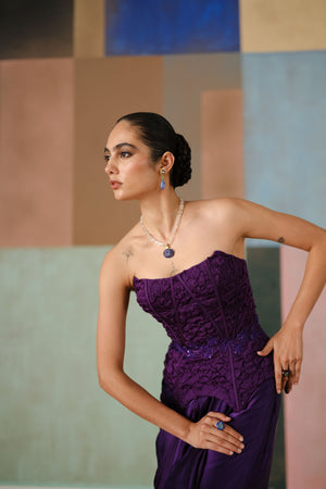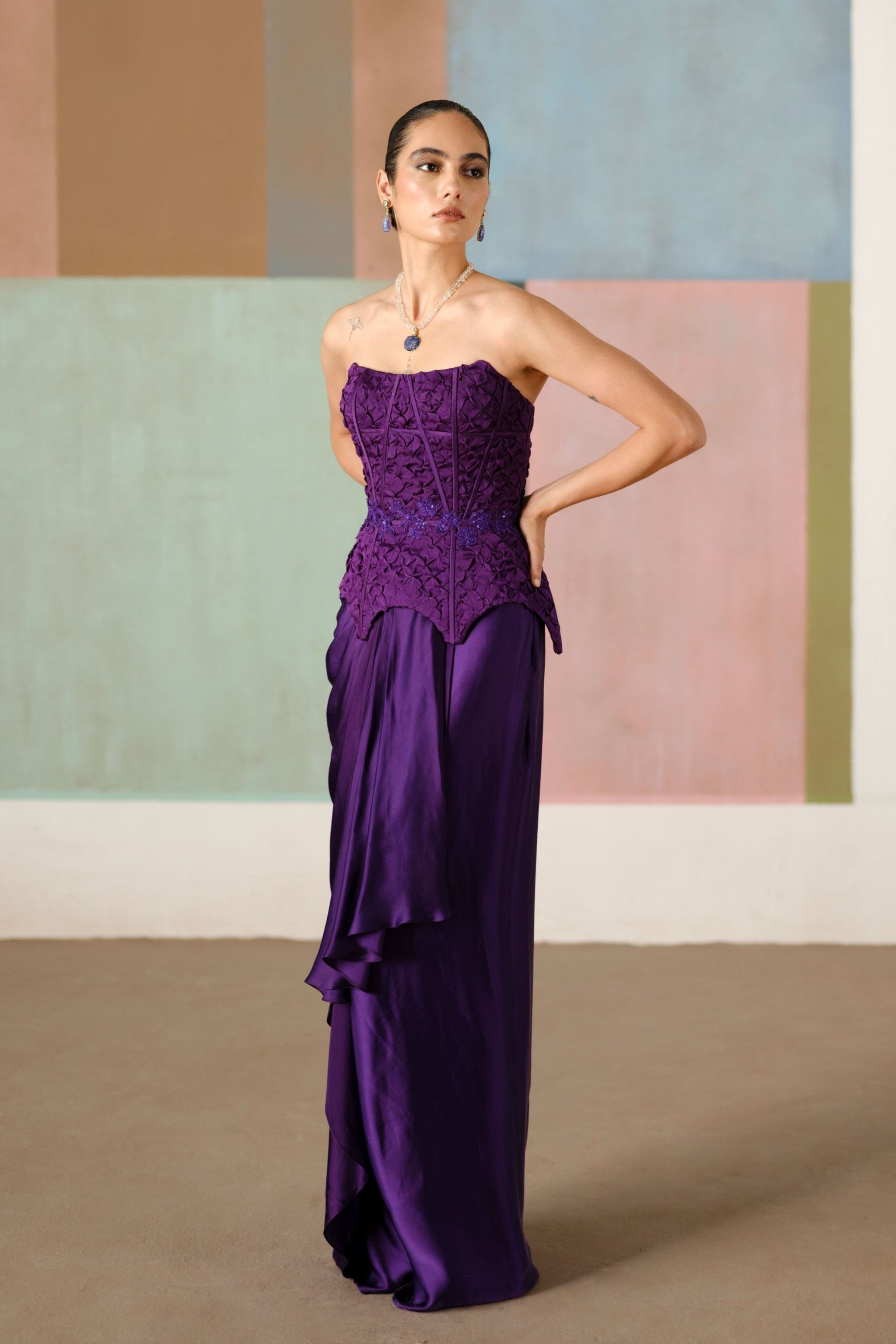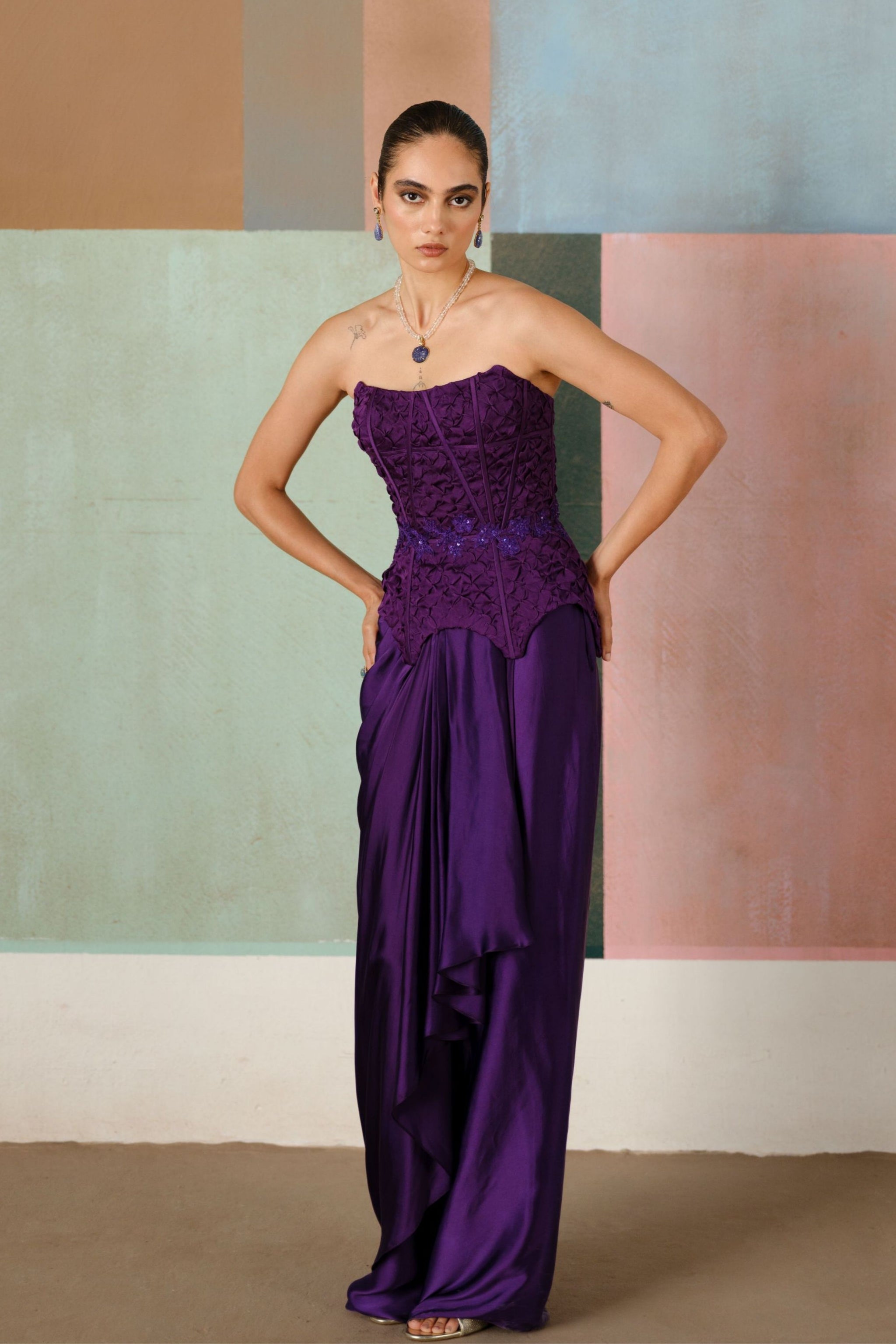 • Smocked corset adorned with wildflower appliqué, elegantly paired with a draped skirt; the corset is padded.