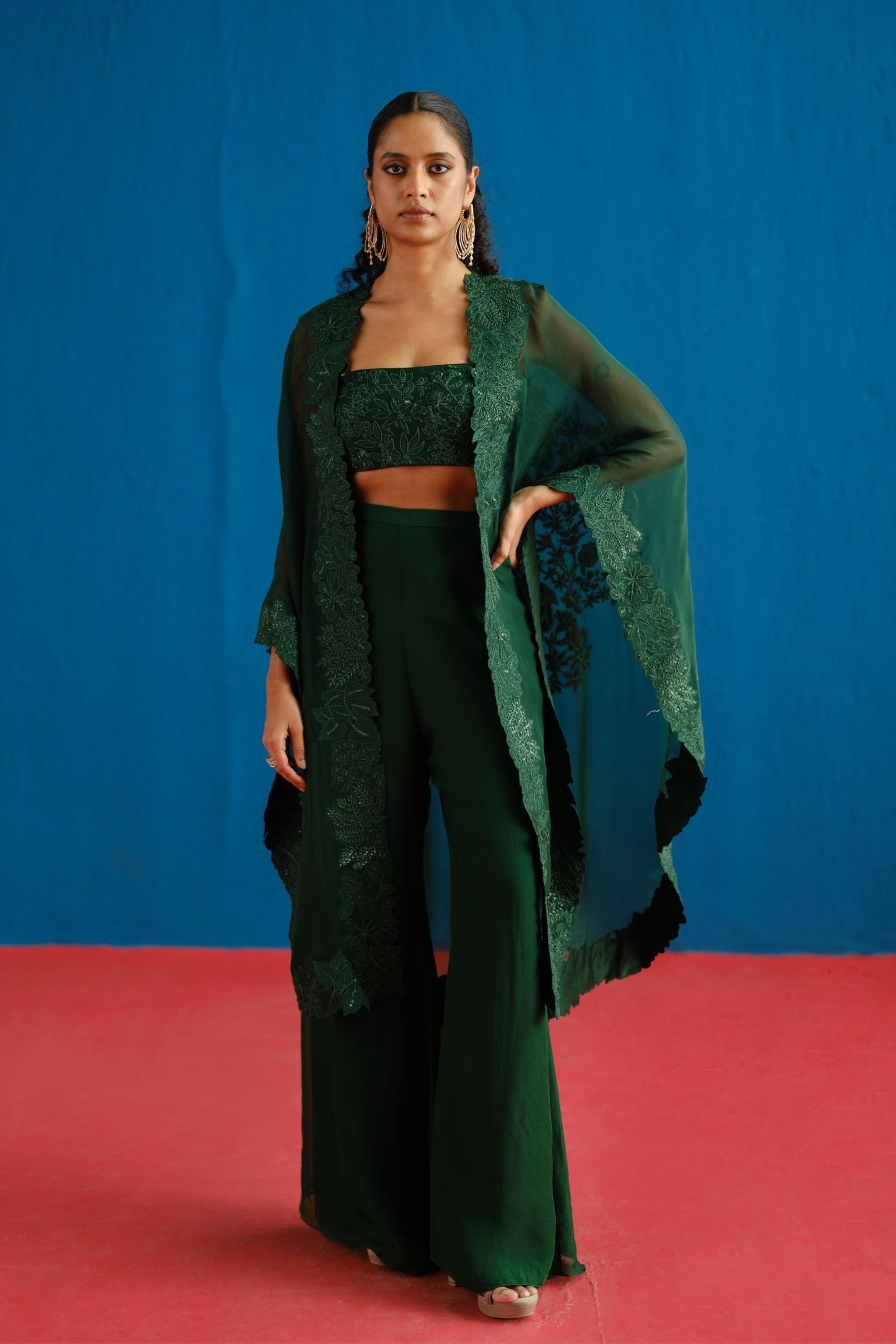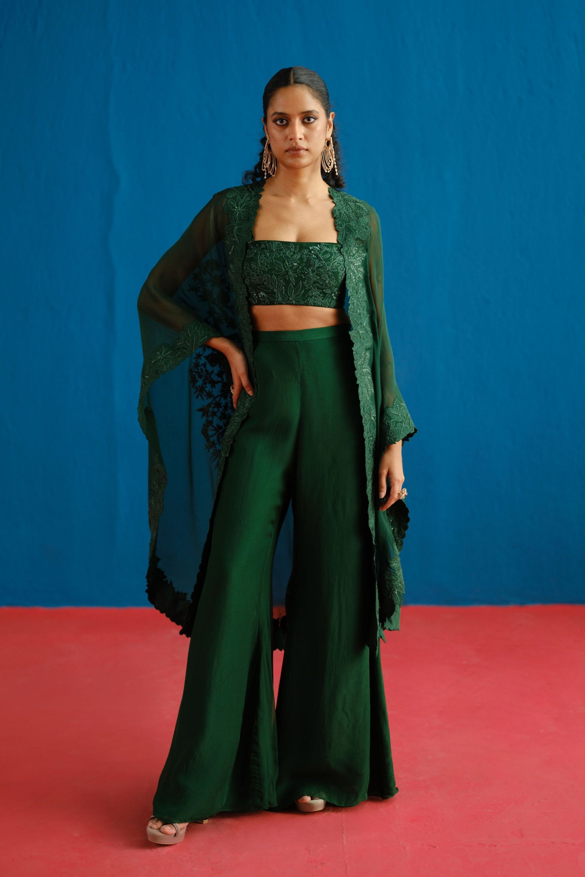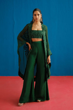 • Tonal Assorted leaves Triangle cape with tonal wildflower embroidered Bustier and Drape skirt