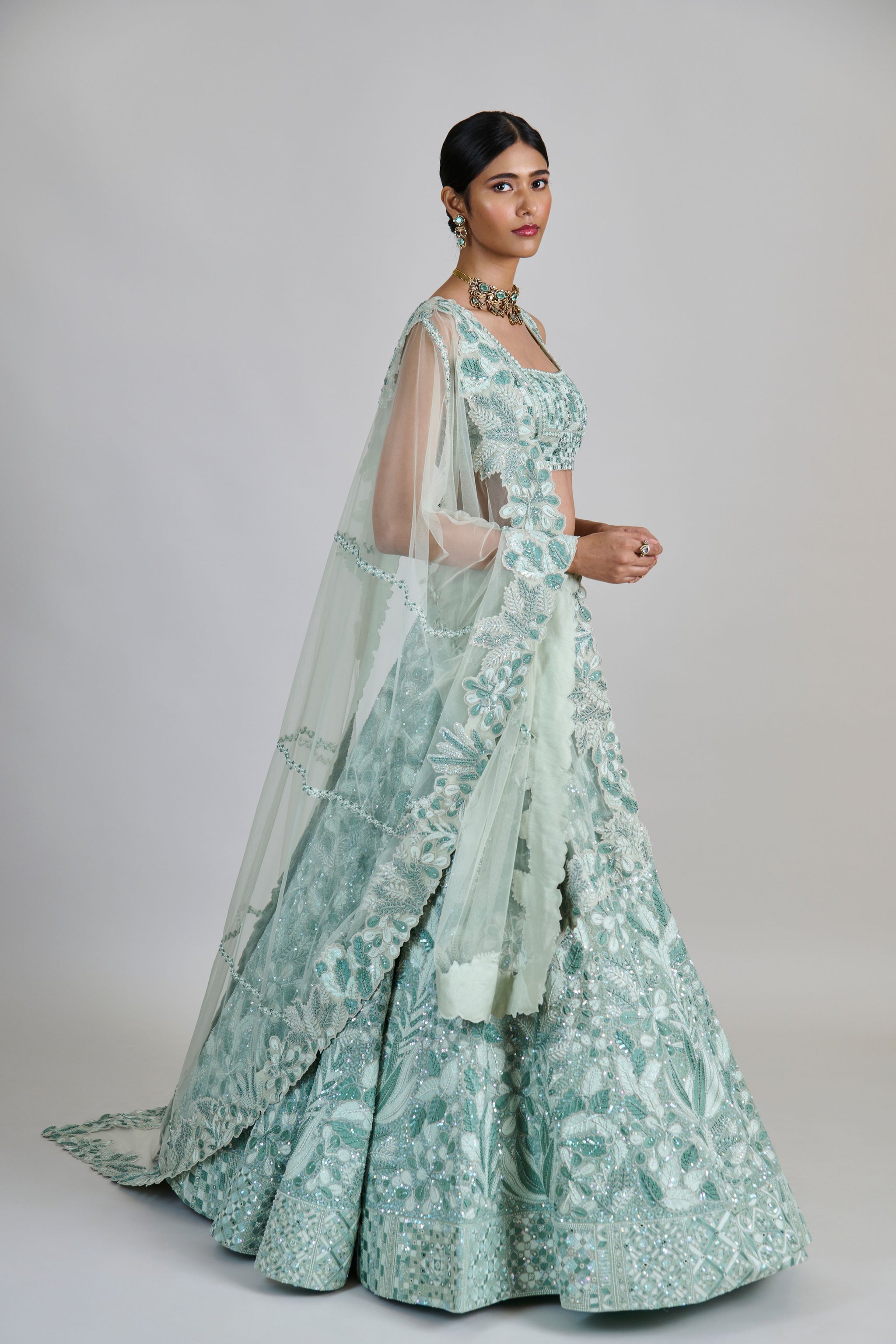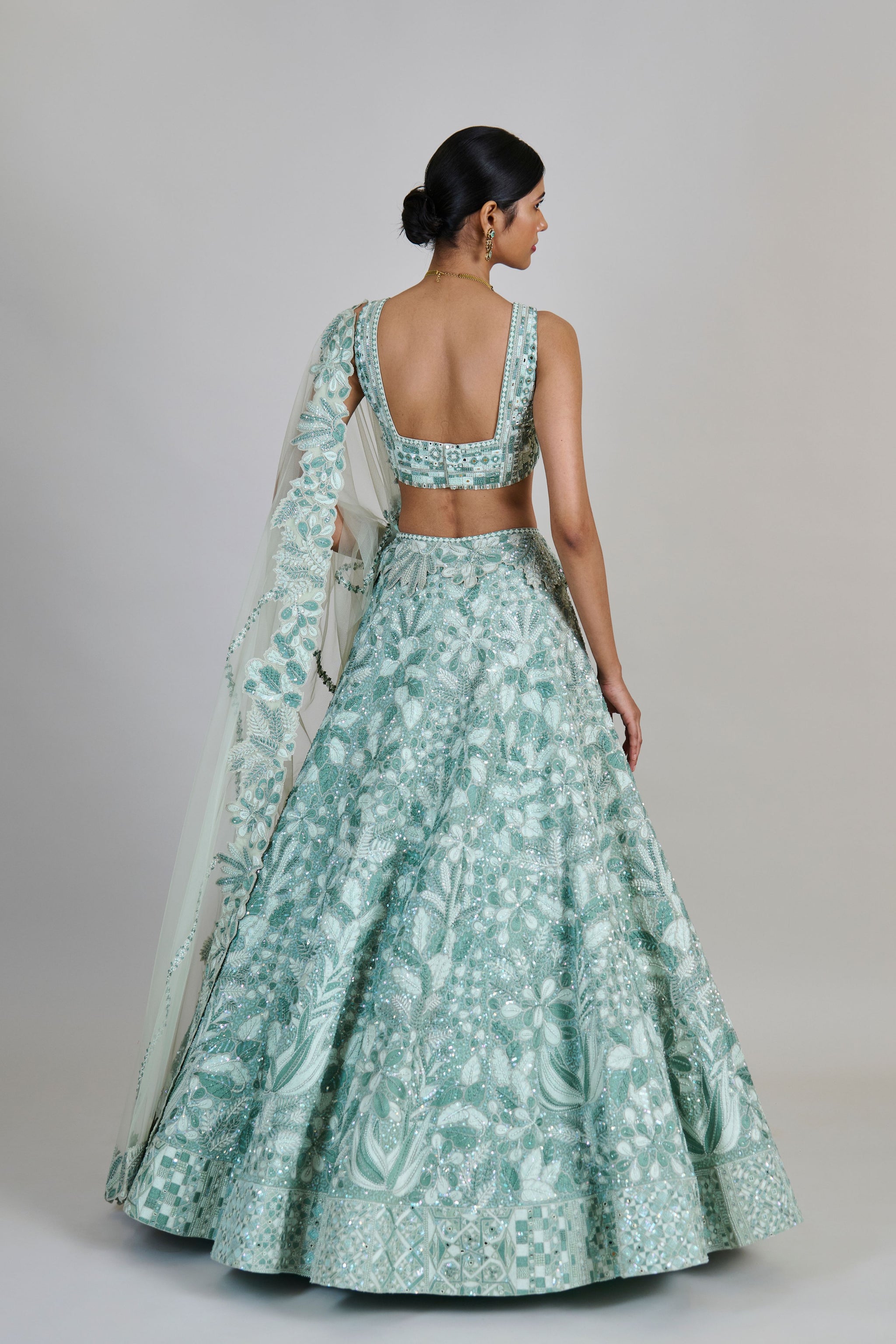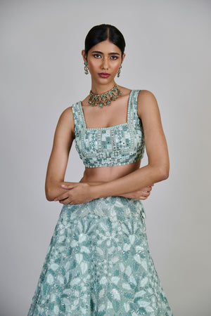 • Assorted leaves duo tone lehenga with sequin gitch paired with a geometric blouse and dupatta.