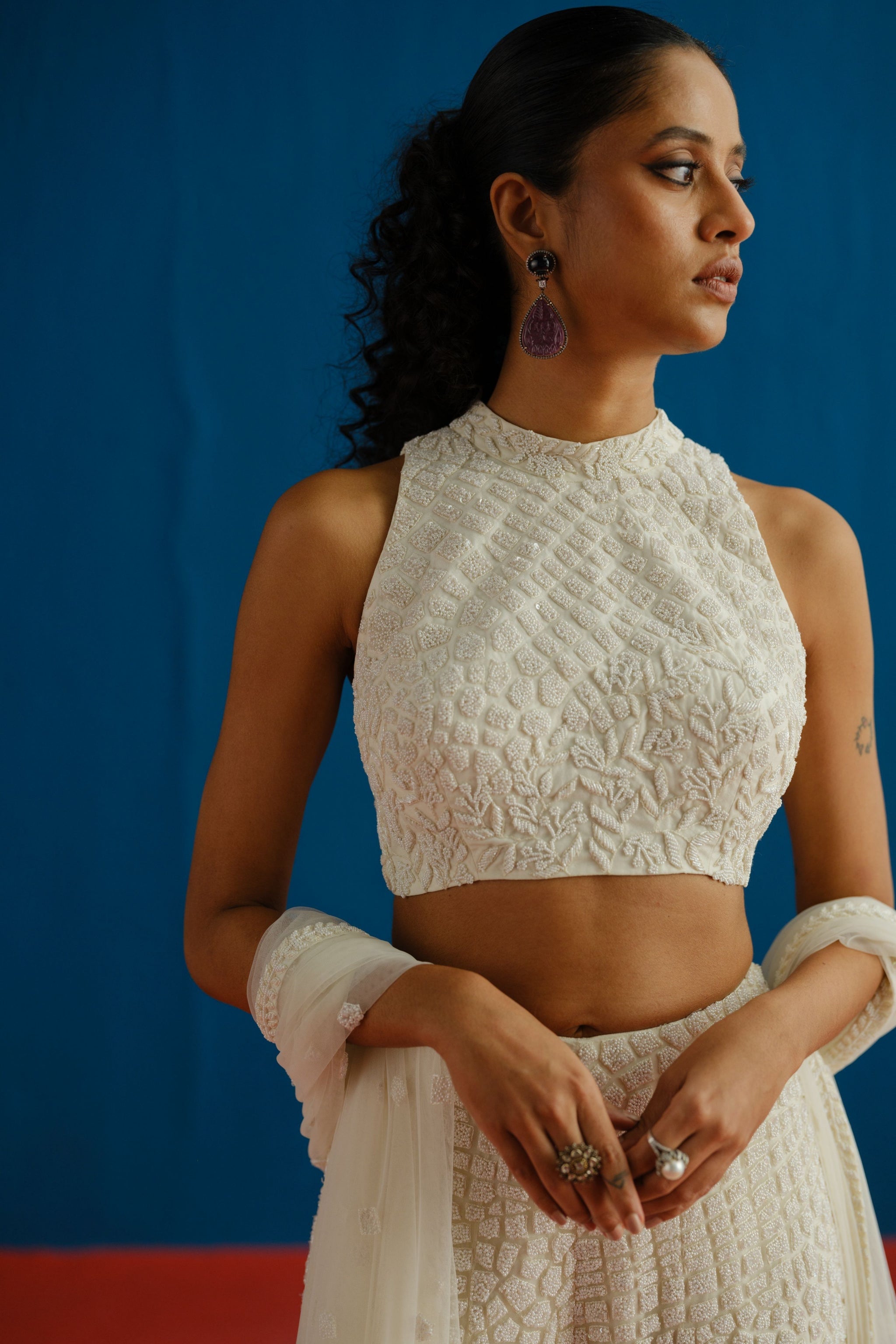 • Hexagon embroidered halter neck crop top and pants paired with an embroidered dupatta; the top is padded.