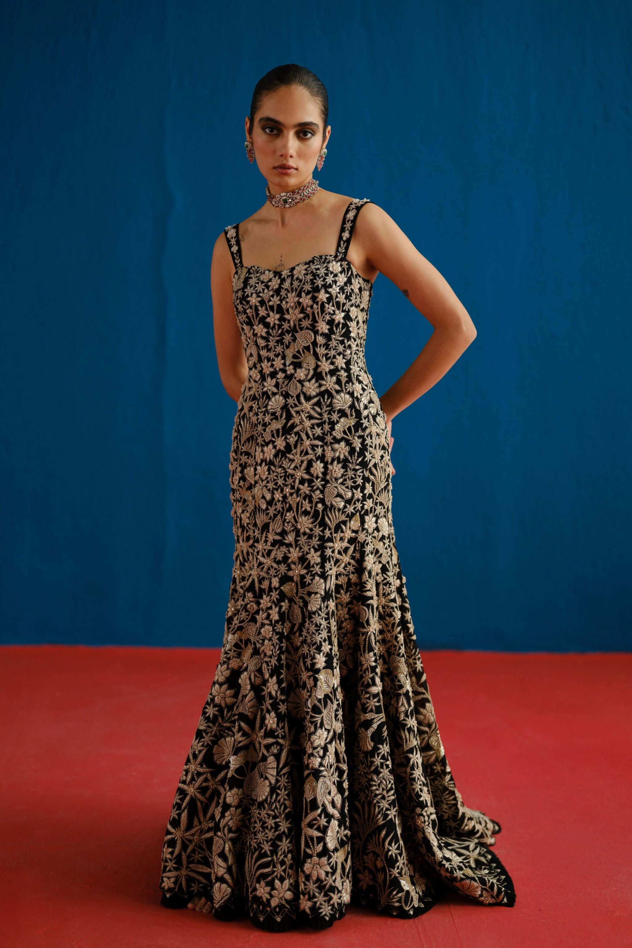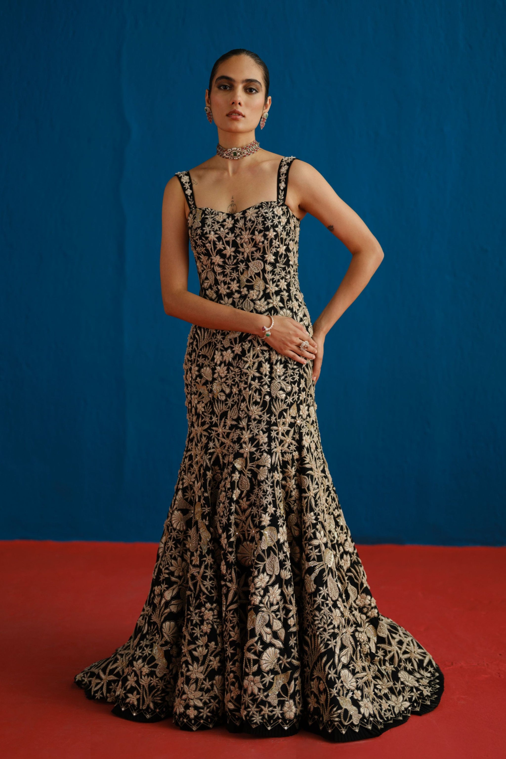 • Contrast wildflower fish-cut gown with checks under the border; the gown is padded, and can-can is attached.