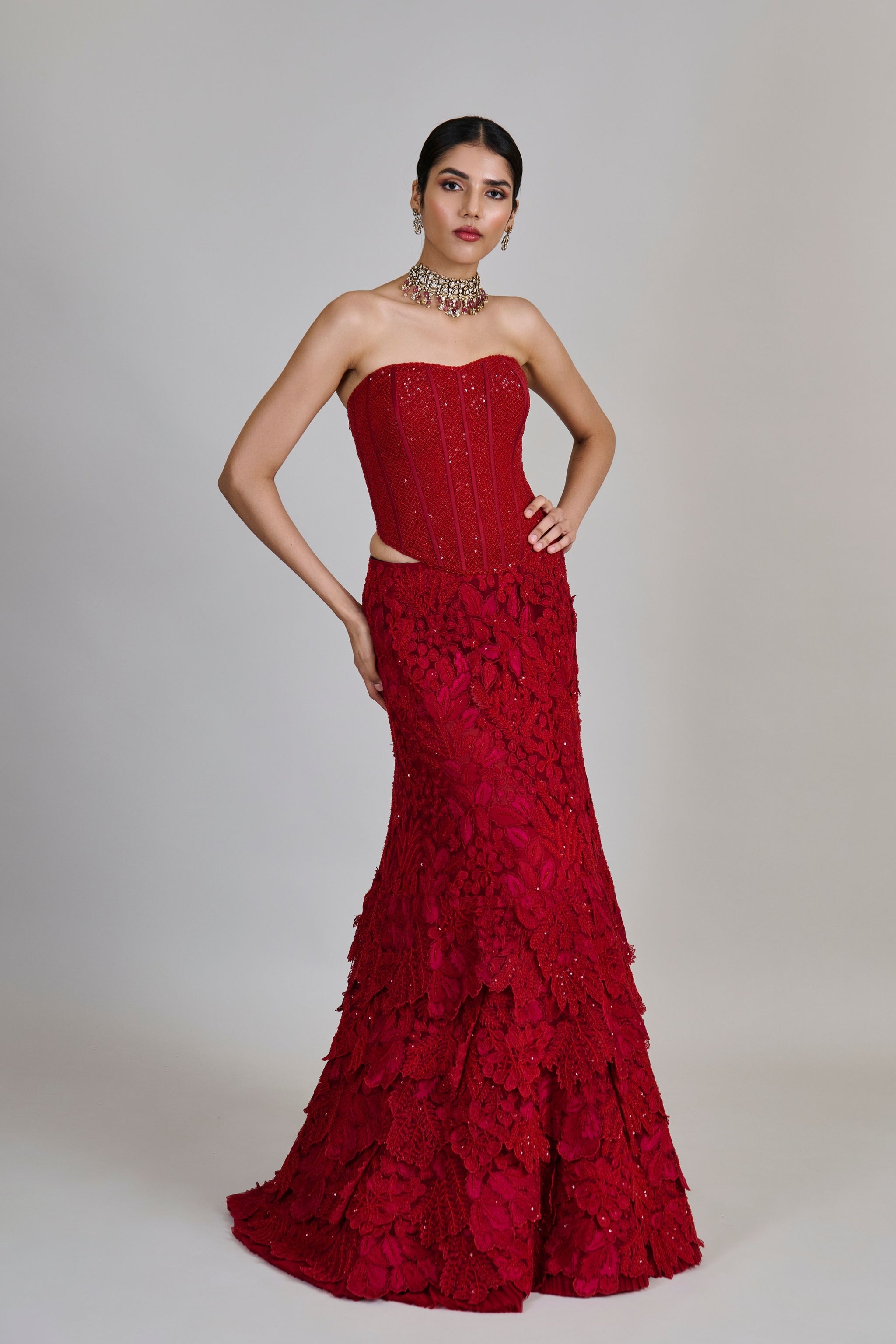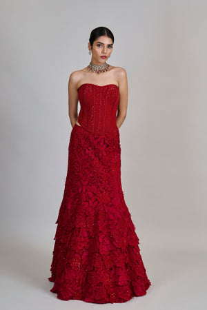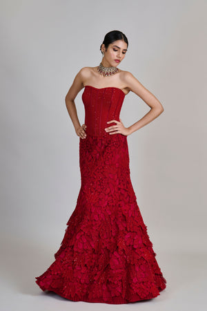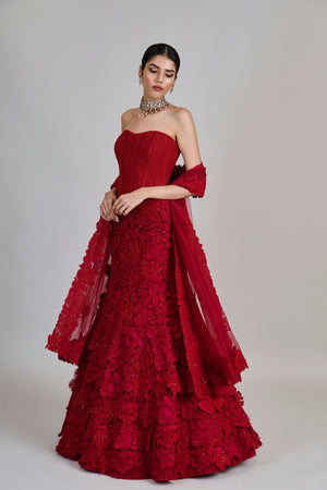• Duo tone assorted leaves fish cut layered skirt with baby checks corset and dupatta.