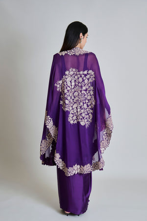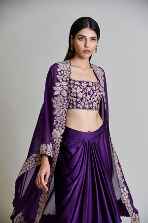 • Contrast assorted leaves triangle cape with back bunch, wildflower bustier and drape skirt.