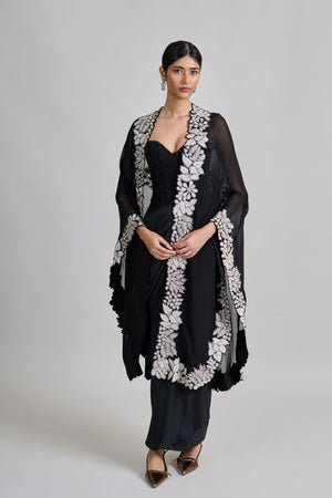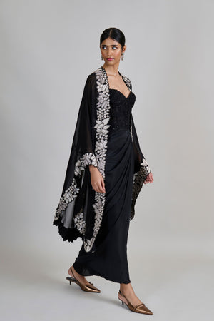 • Contrast assorted leaves triangle cape with tonal embroidered corset and draped skirt.