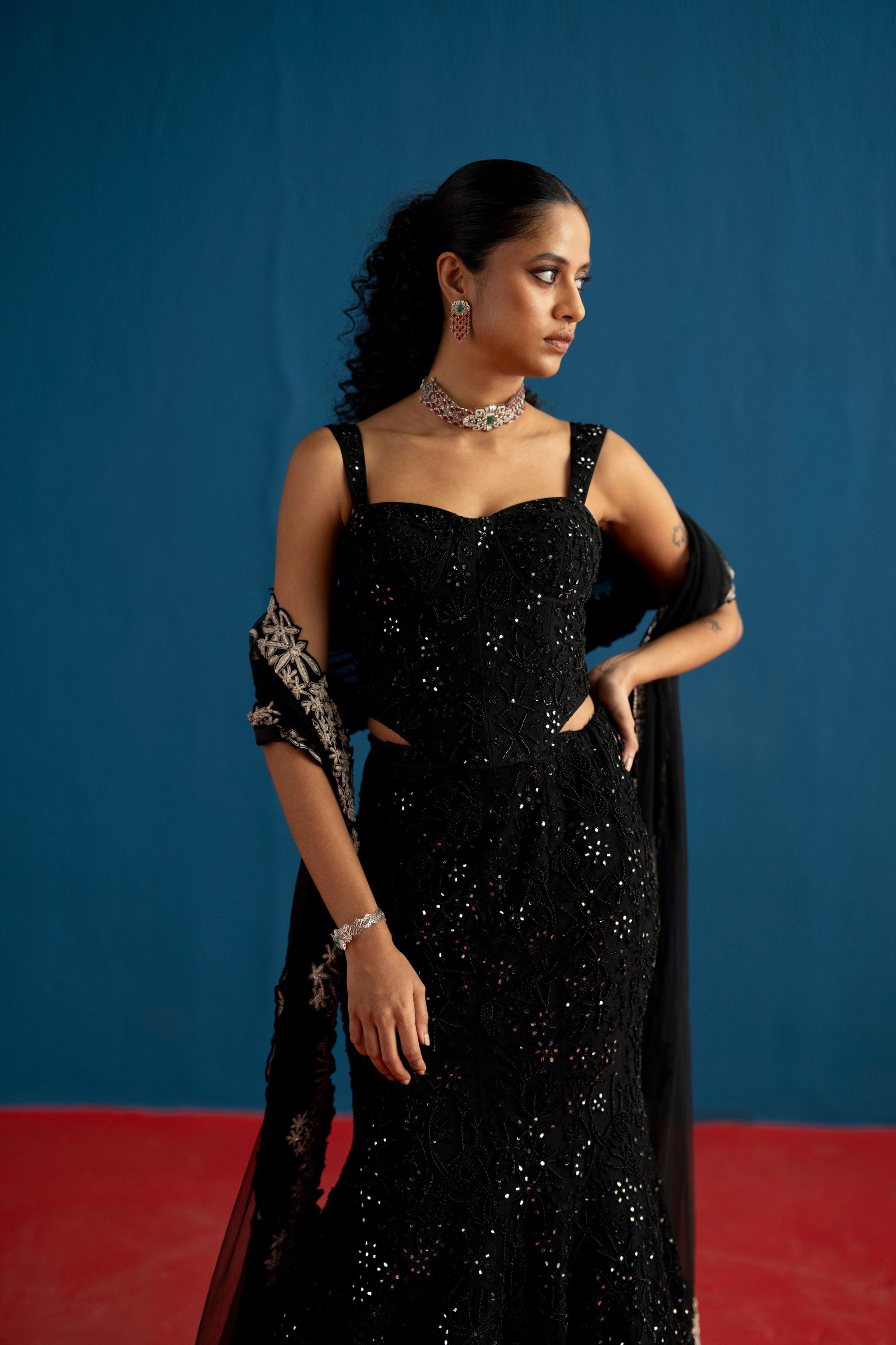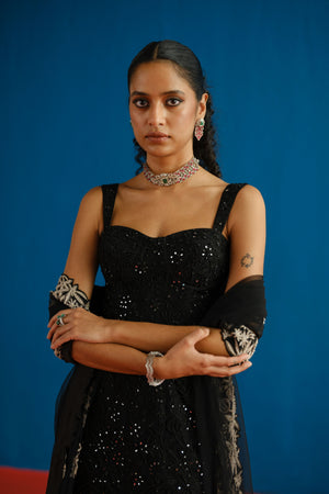 • Tonal gradient fish-cut skirt paired with a wildflower corset and dupatta; the corset is padded, and can-can is attached to the skirt.