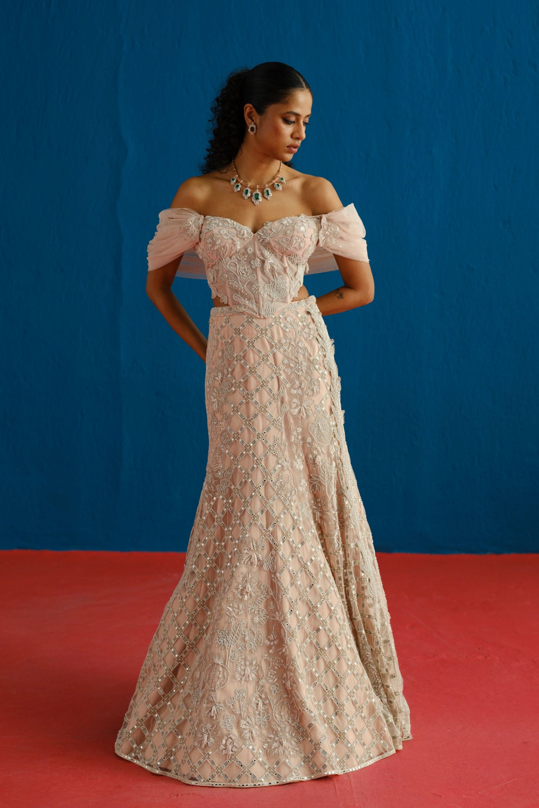 • Tonal tropical embroidery with checks grid placement skirt paired with a tropical appliqué corset and tulle drape; the corset is padded, and can-can is attached to the skirt.