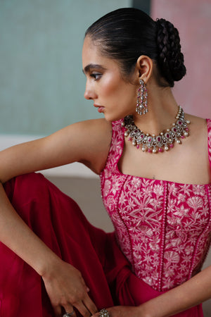 • Contrast wildflower embroidered corset paired with a ruffle saree; the blouse is padded.