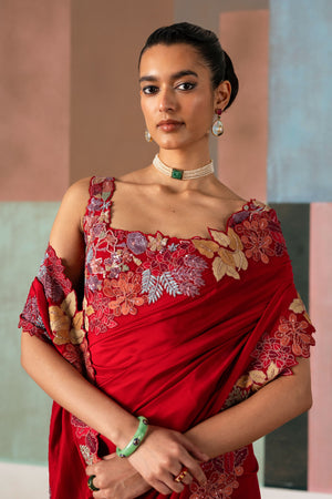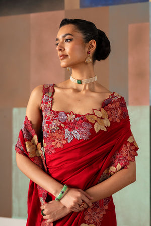 • Multicolour assorted leaves and wildflower mix border saree paired with a padded blouse.