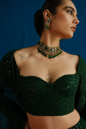 • Sea coral mermaid lehenga paired with a full-sleeve blouse and cutwork dupatta.