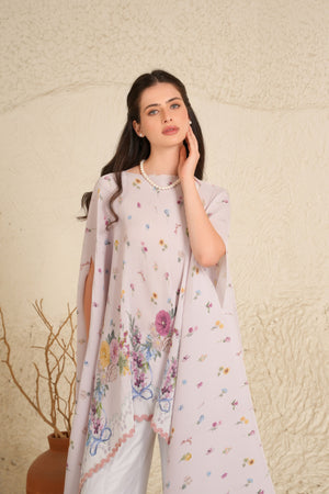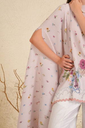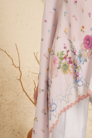 • Crafted to capture movement and grace, ditsy florals float across pleated white satin, framed with a subtle powder blue border. A chanderi trouser with a blossoming floral hem completes the narrative, creating a silhouette that is both fluid and enchanting.