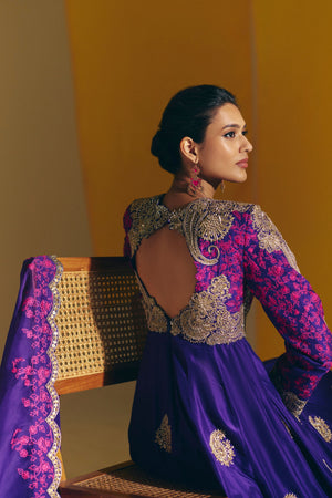 • Silk anarkali with pearl and zardozi hand embroidered paisleys, florals and geometric motifs with intricate floral jaal in contrast hotpink resham on the yoke and panelled sleeves. Paired with a purple organza dupatta with scalloped border in zardosi and intricate floral jaal in hotpink resham with hot pink handmade tassels.