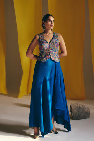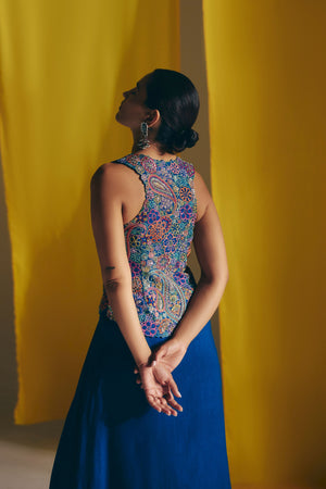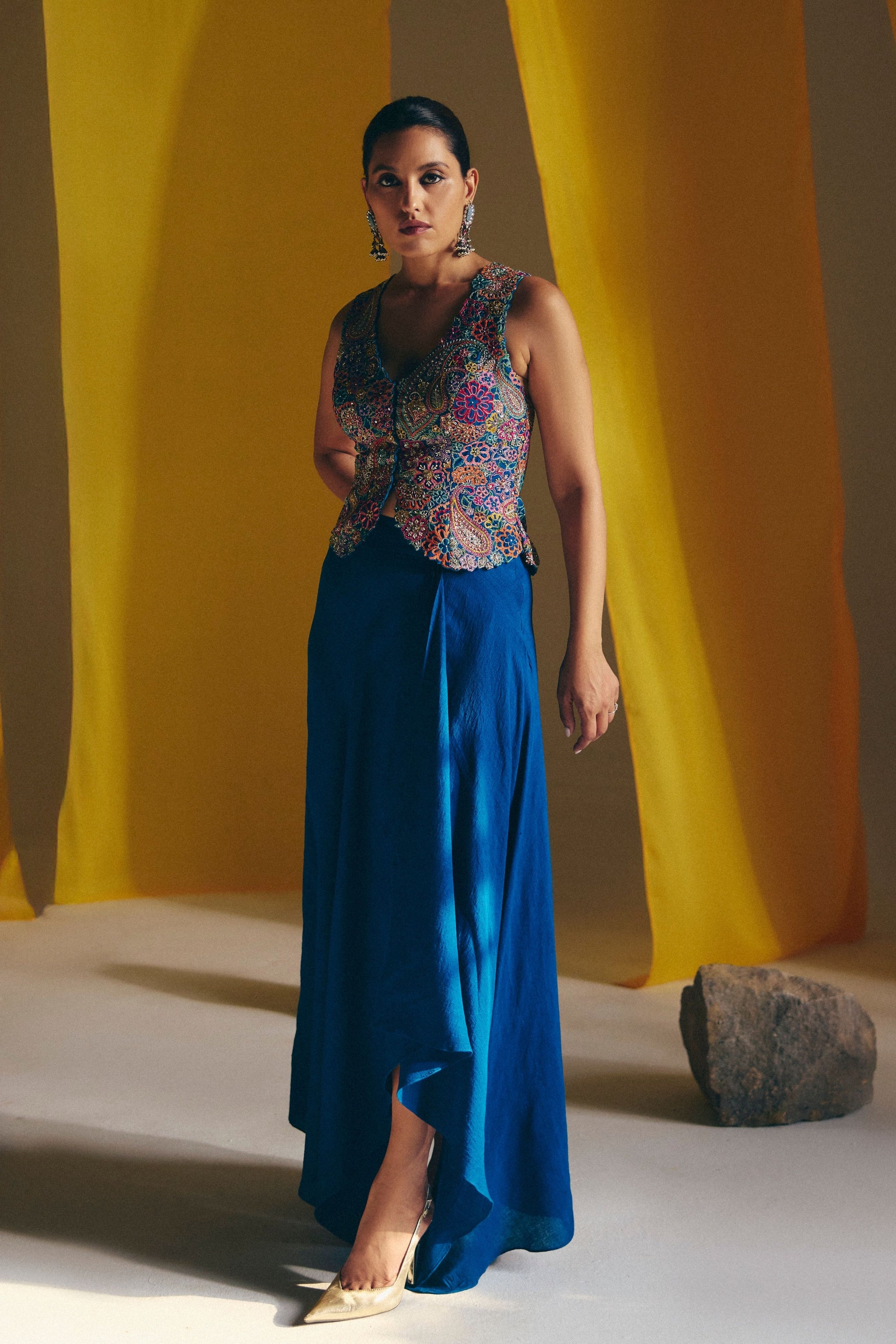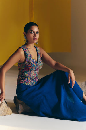 • A vivid blue hand-embroidered racerback waistcoat with multi-color resham and zardozi embroidery. Paired with a matka silk draped skirt.