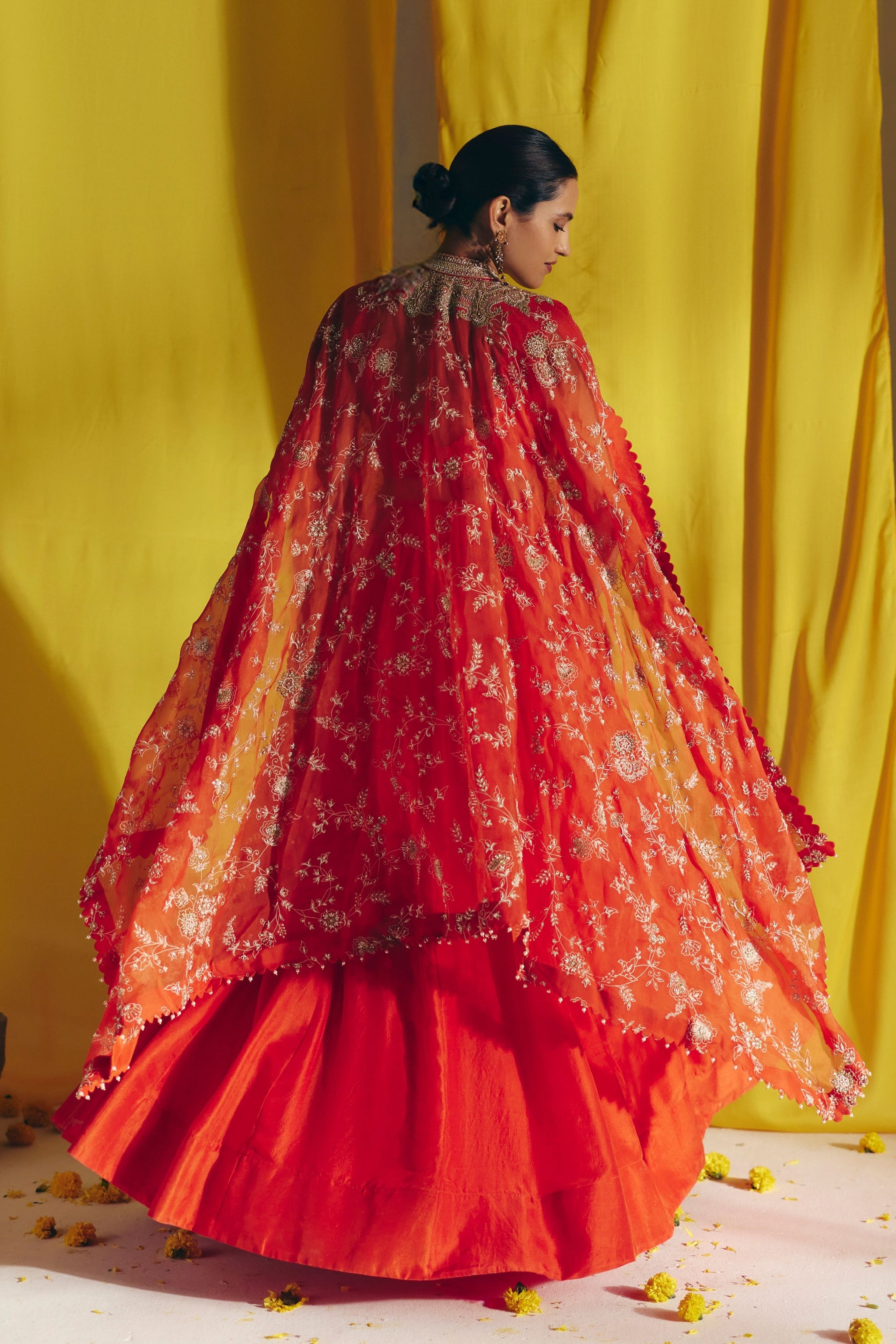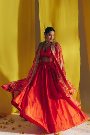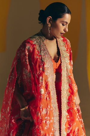 • An orange silk organza cape crafted with intricate jaal artwork highlighted with zardozi and pearls, edged with pearls at the hem. Paired with a short blouse and a gathered lehenga, adorned with cross lines textured embroidery on the blouse and the lehenga waist belt.