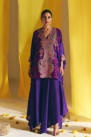 • A purple silk short cuff kurta adorned with a combination of signature long paisleys, mandala, geometric motifs, and contemporary flowers placed along the front and cuffs embroidered with multi-colored resham and zardozi work. Intricate floral jaal with resham delicately placed along the sides. Paired with a silk kaftan pants.