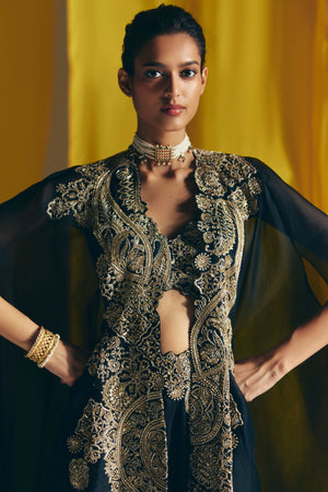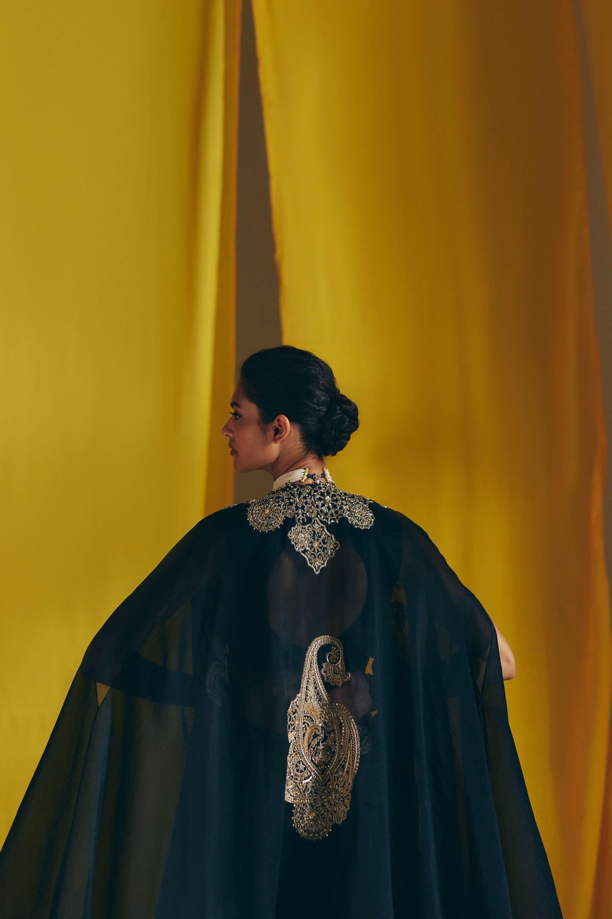 • A black organza cape adorned with a combination of signature long paisleys, mandala, geometric motifs, and contemporary flowers placed along the front. Hand-embroidered with zardozi. Paired with an embroidered short blouse and pure silk cowl pants.