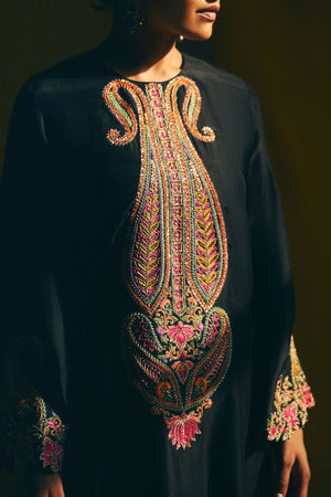 • A silk straight kurta with side slits and funnel sleeves, adorned with signature granduer long paisley artwork with multi-color resham and zardosi embroidery, with a tiny scallop detail on the slits. Paired with wide-legged silk pants.