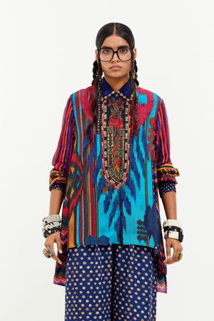 • Printed Italian Crepe Shirt With Detailed Collar embroidery Type - Dori Work With Seqins And Moti front-29" Back-32" note - Slight Variation In Print