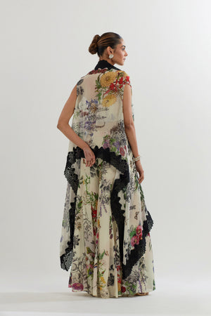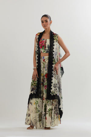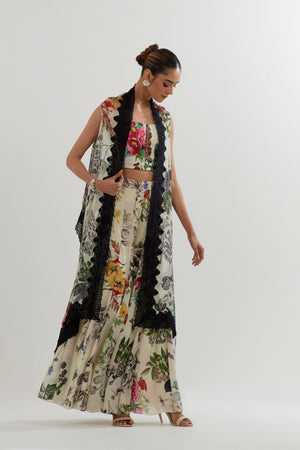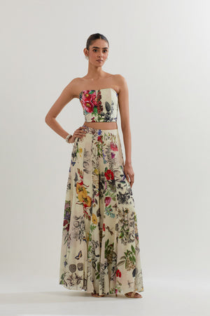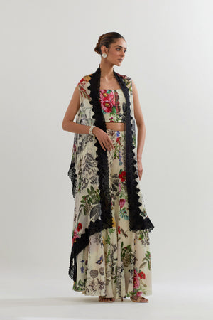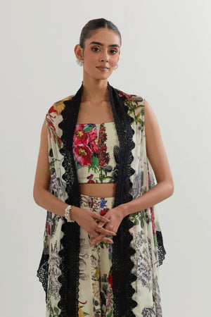• Botanical Printed Panelled Pants Paired With Stretch Bustier and Cape