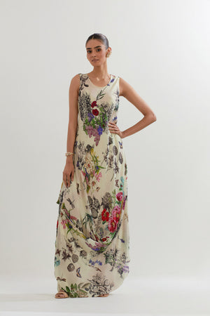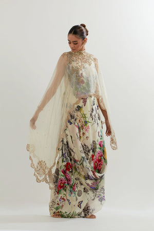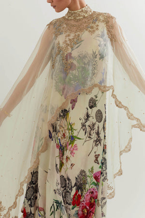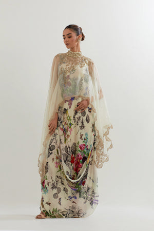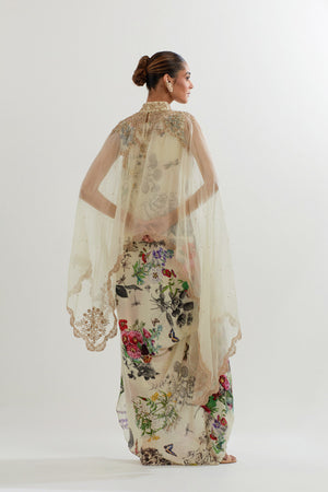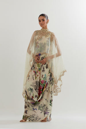 • Botanica Printed Cowl Dress Paired With Organza Hand Embellished Cape