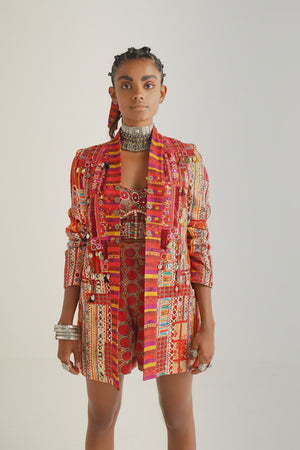 • Printed corset blouse with embroidery highlight paired with printed shorts and collage print open jacket.
