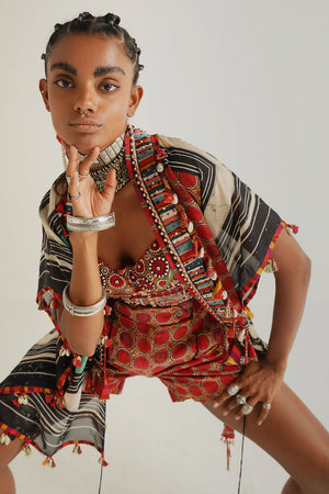 • Printed corset blouse with embroidery highlight paired with printed shorts and printed dupatta jacket.