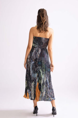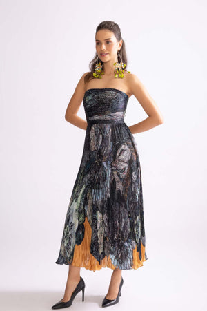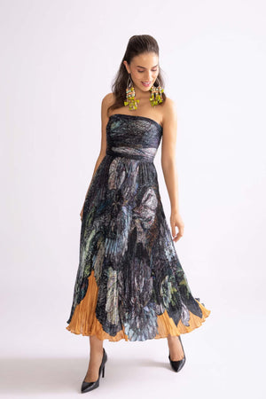 • Daisy print, hand micro pleat strappless midi dress