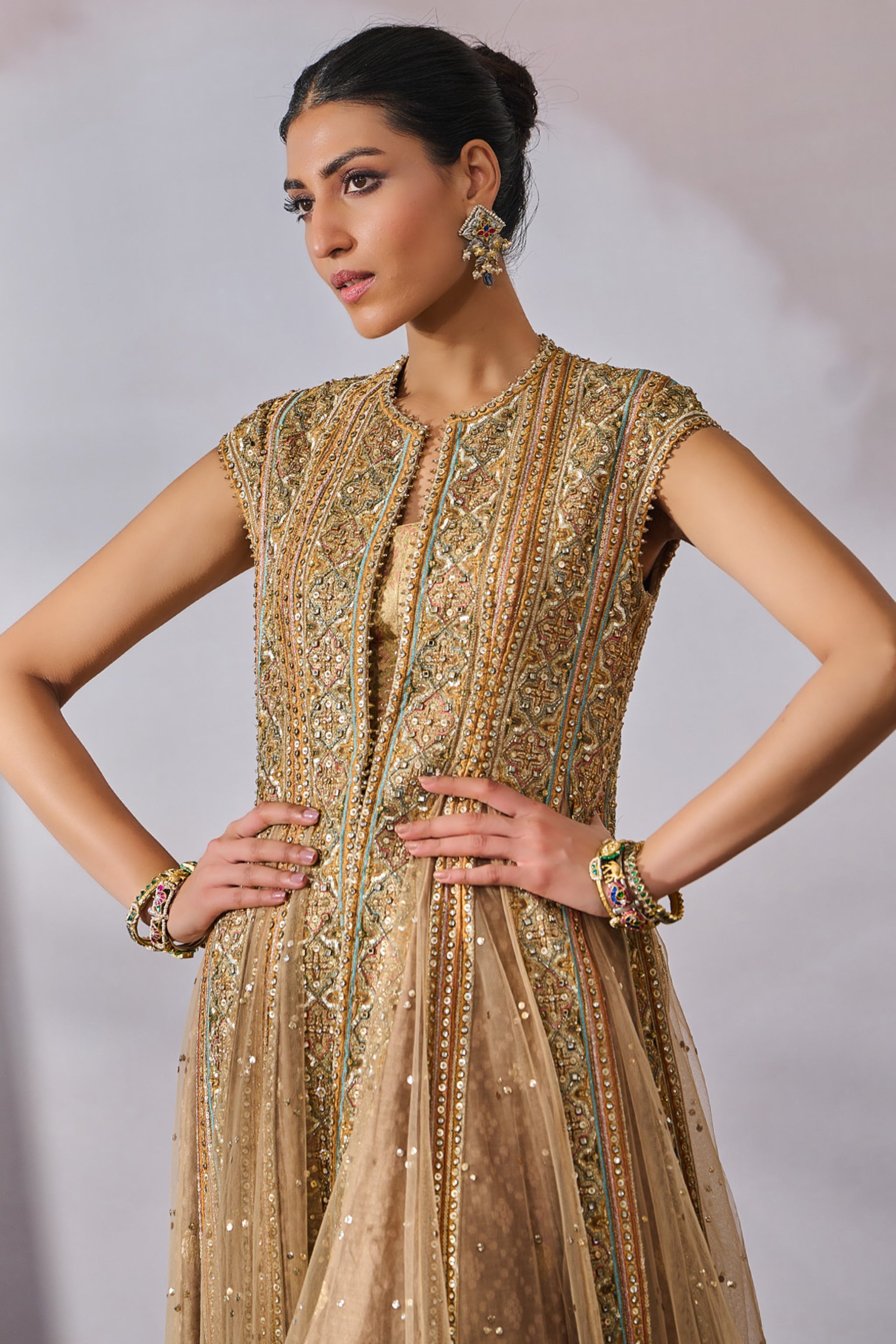 • Hand embroidered paneled jacket paired with a structured brocade bustier and tapered pants. It is paired with a brocade bustier and tapered trousers with an intricately embroidered waist detail.