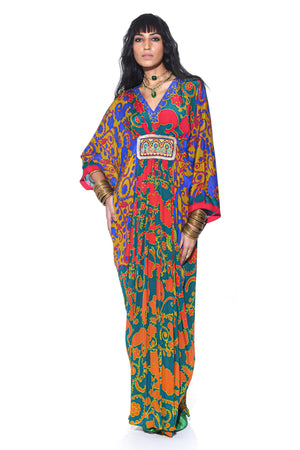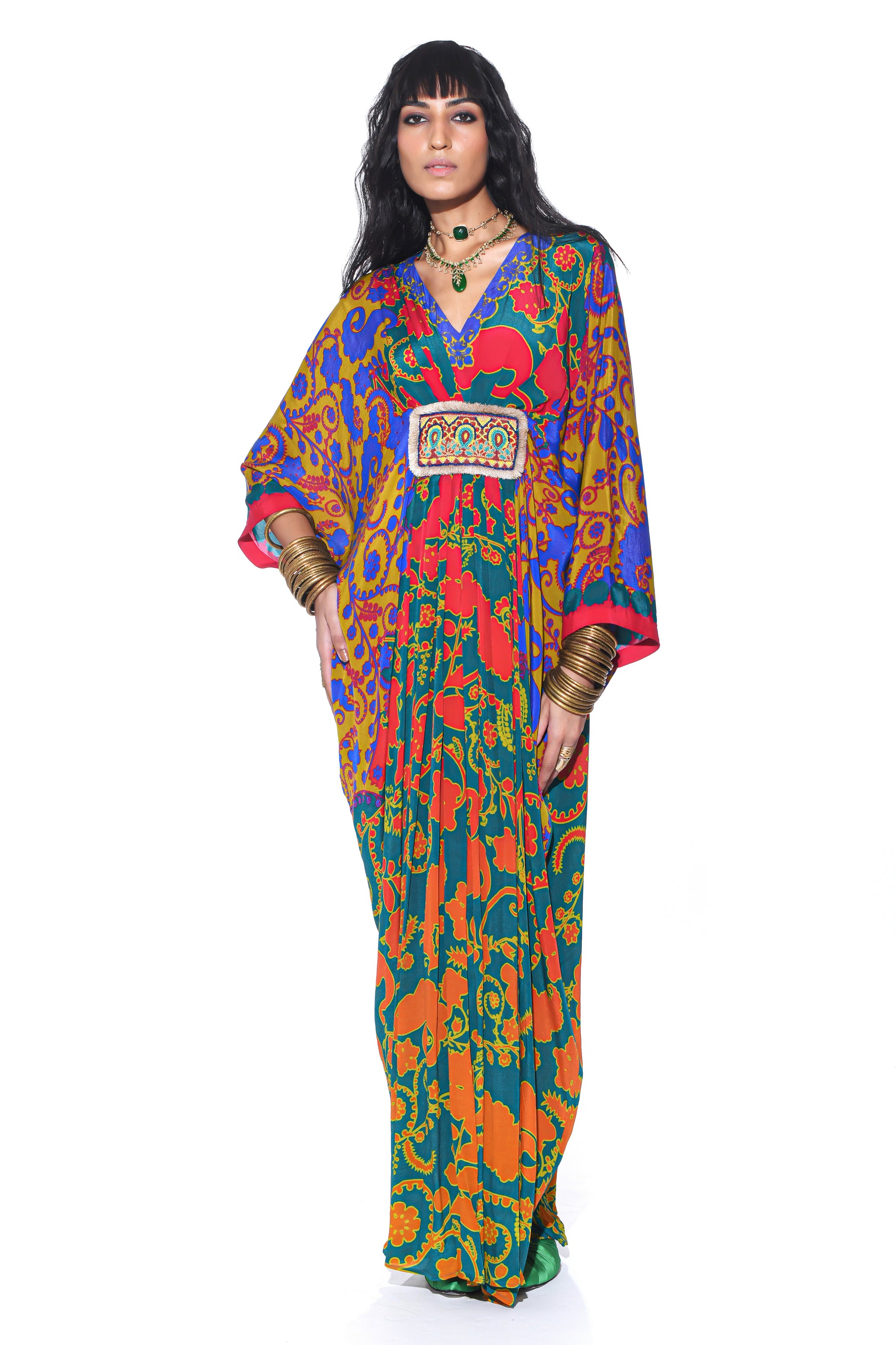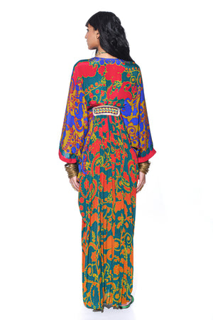 • Orange ombre, green tone one tone sb signature paisley print, pleated kaftan with hand bead embroidery in front and back.