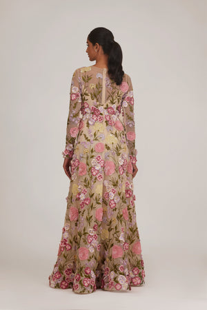 • This tulle gown is beautifully crafted with 3d floral hand embroidery and sequinned blossoms all across, creating a statement bridal ensemble.