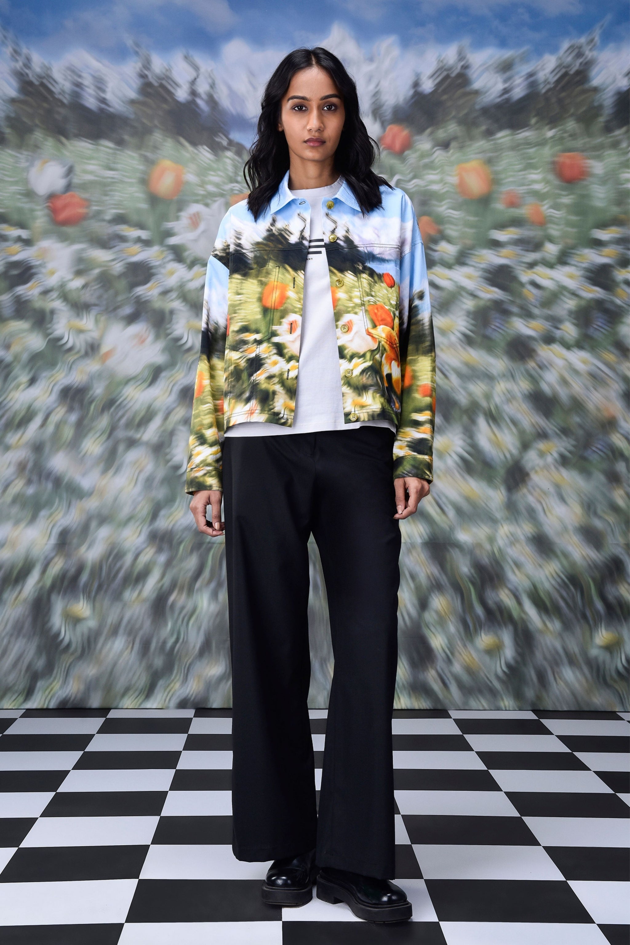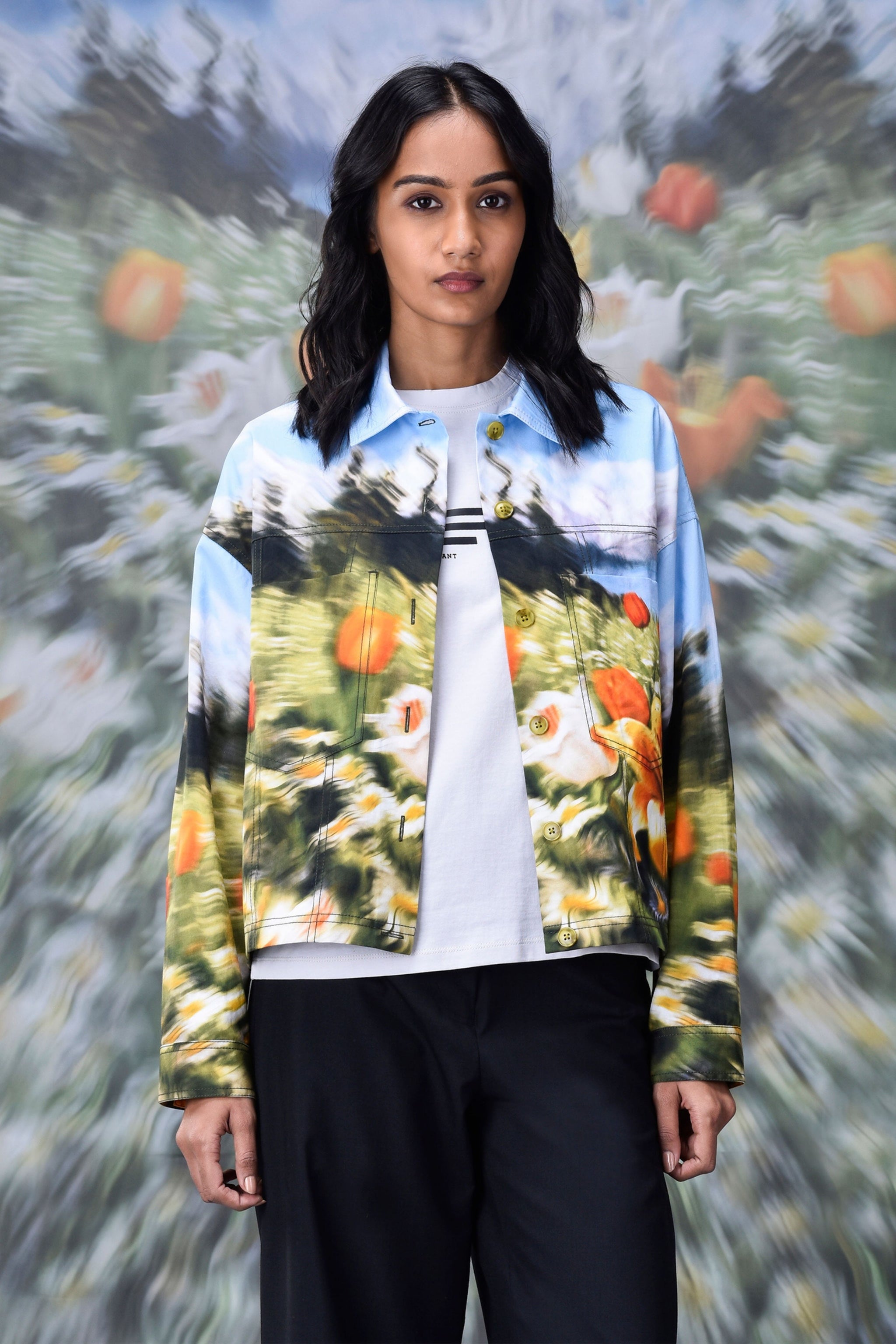 • Elevate your wardrobe with our, heavy twill jacket with tiger lilies, tulips and daisies galore, with a heightened feeling of motion and blur, because as didier lecoanet quotes ,"a distorted garden print is like a moment stolen from a dream, vague and striking all at once.”