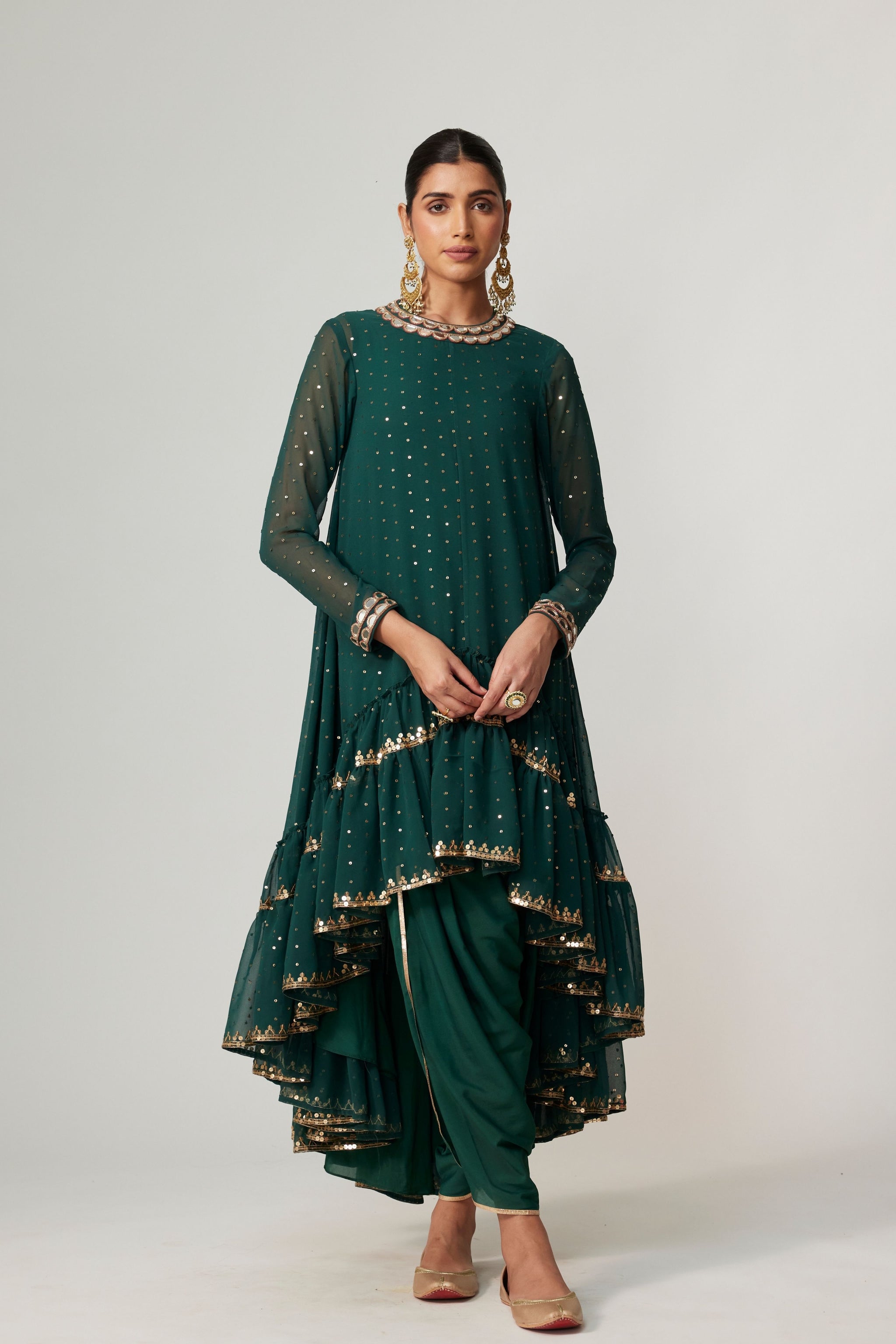 • Jade green sequins embroidered kurta paired with a dhoti.