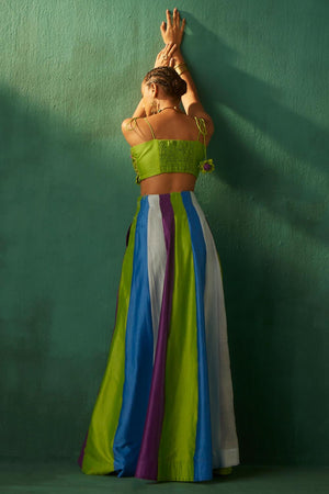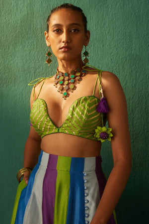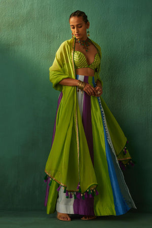 • Have a knack for vivid tints? Don't miss out on our gorgeous chanderi lehenga set for this festive season. Made in soft chanderi silk. Skirt is highlighted with an interesting color blocking. It features a front slit, button up for that sophisticated look, or button down for some leg show. It has a side seam zipper and inseam pockets for that added comfort. Top features a plunging neckline, highlighted with gold metal gota, contrasting piping and a tie up detail with handmade flowers and tassels at the shoulder. It has bust cups and elasticated back for that added comfort. It comes with a beautiful organza dupatta, highlighted with delicate hand embroidery, contrasting hand made tassels and cowrie shells. Styling tip- accessories it with traditional chandbali and statement bangles for a winning look.