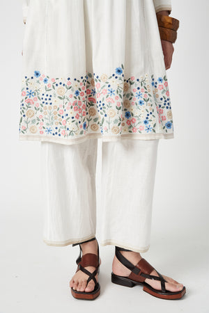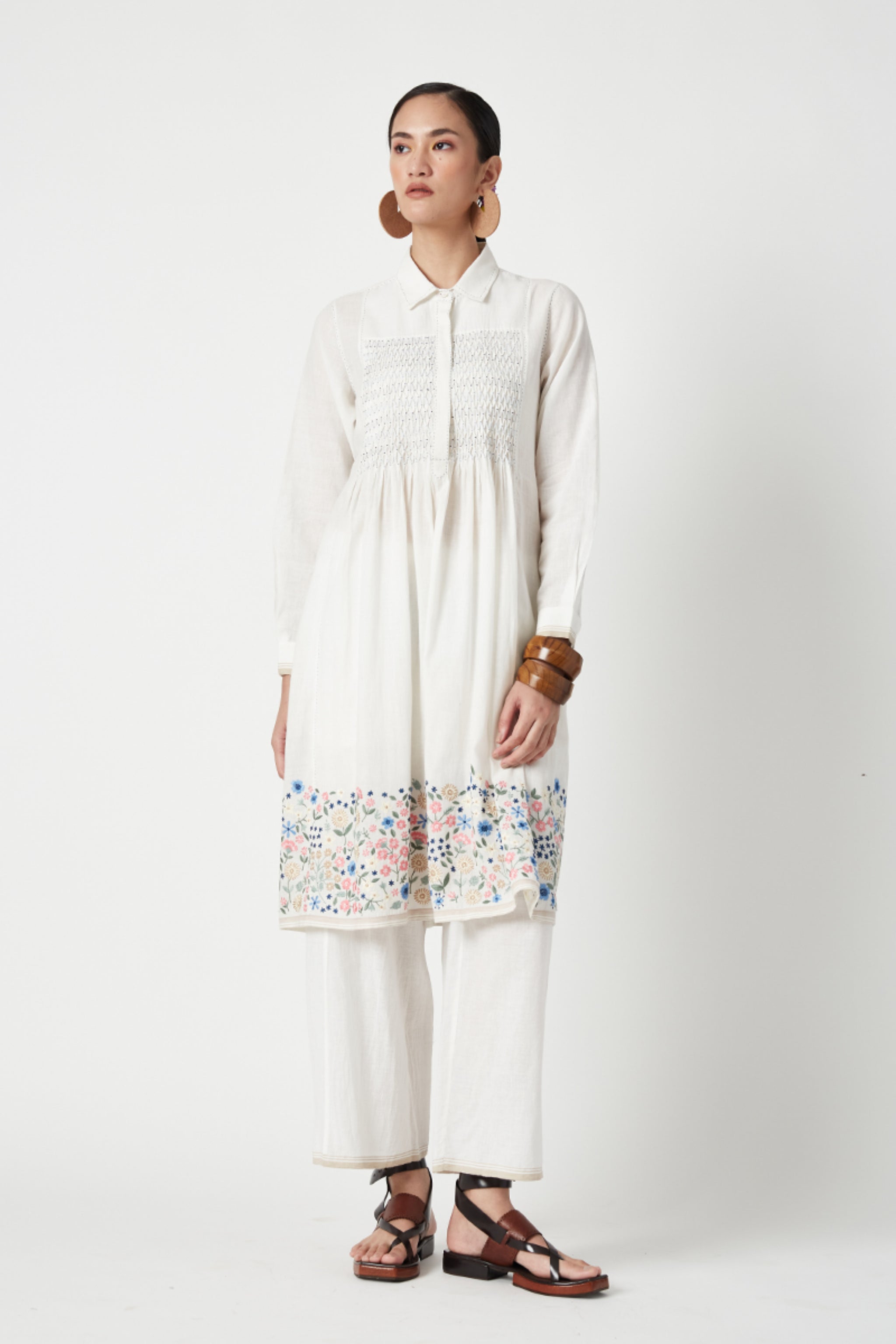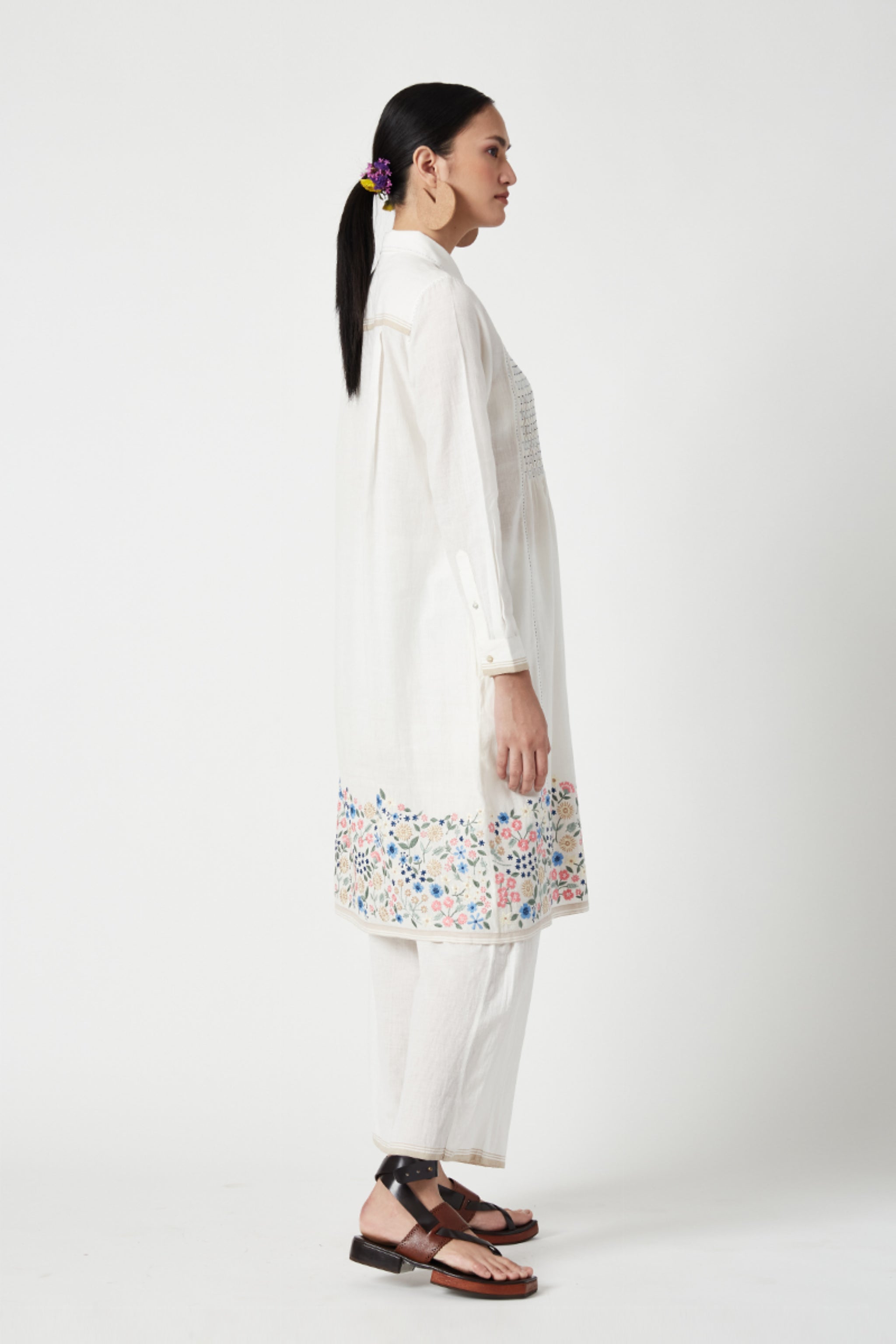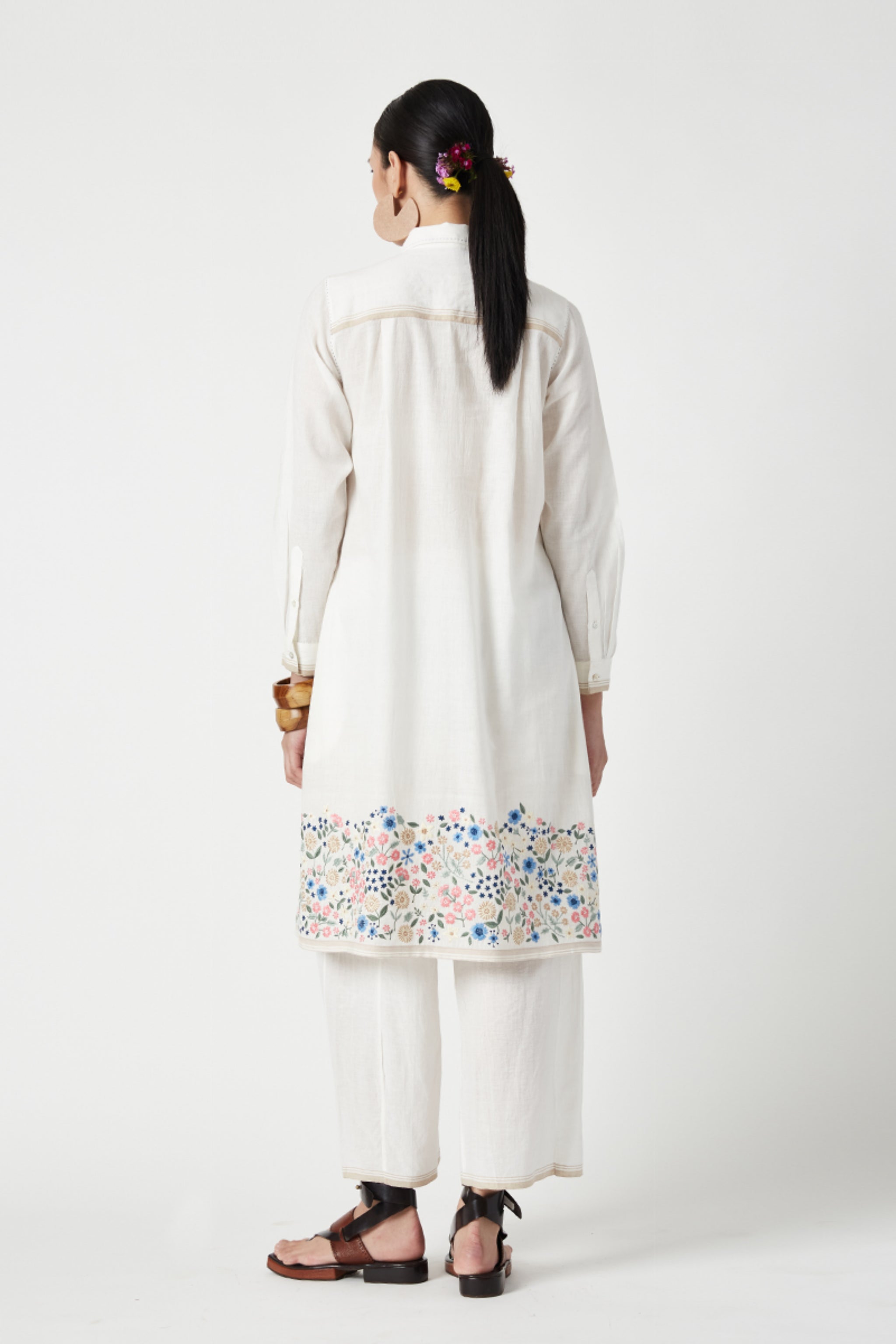 • A classic collared buttoned down concealed placket tunic with embroidered multicolor floral motifs sprinkled all over the base and contrasting selvedge detailing. Paired with tonal straight pants with selvedge. Wear as an office staple or dress it up as a leisure ensemble.