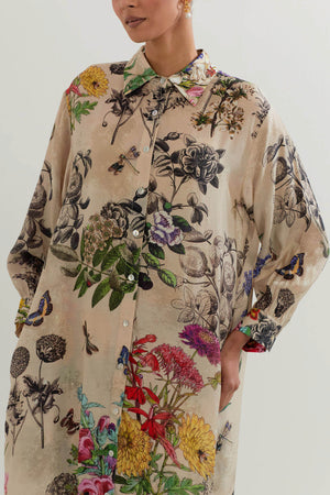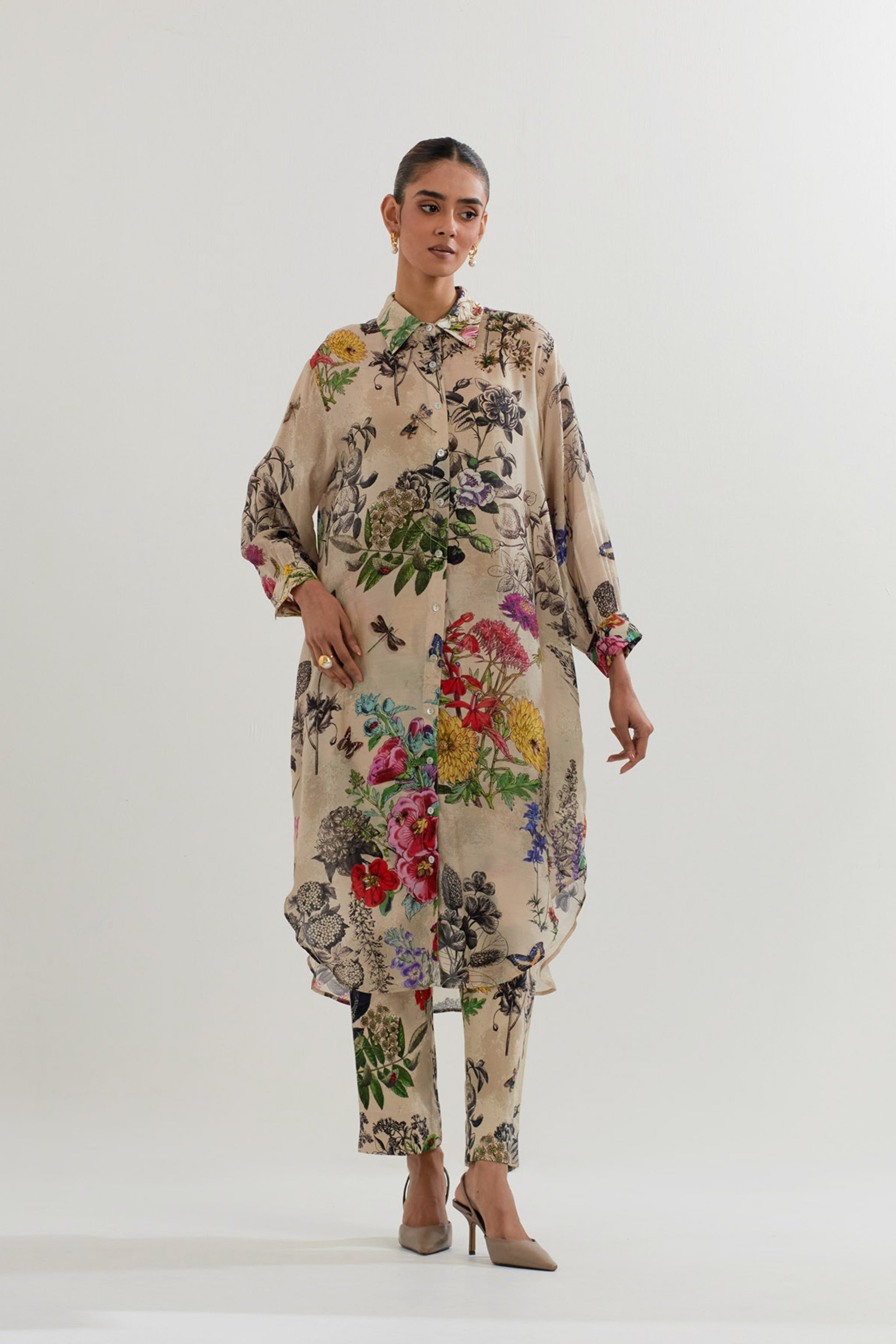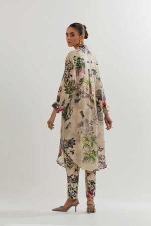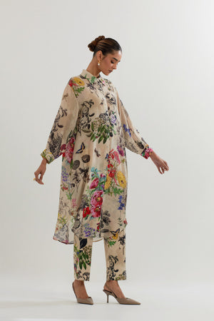• Long Shirt Tunic in Botanical Print With Rehsam Embrodroidered Border Paired With Stretch Cotton Pants