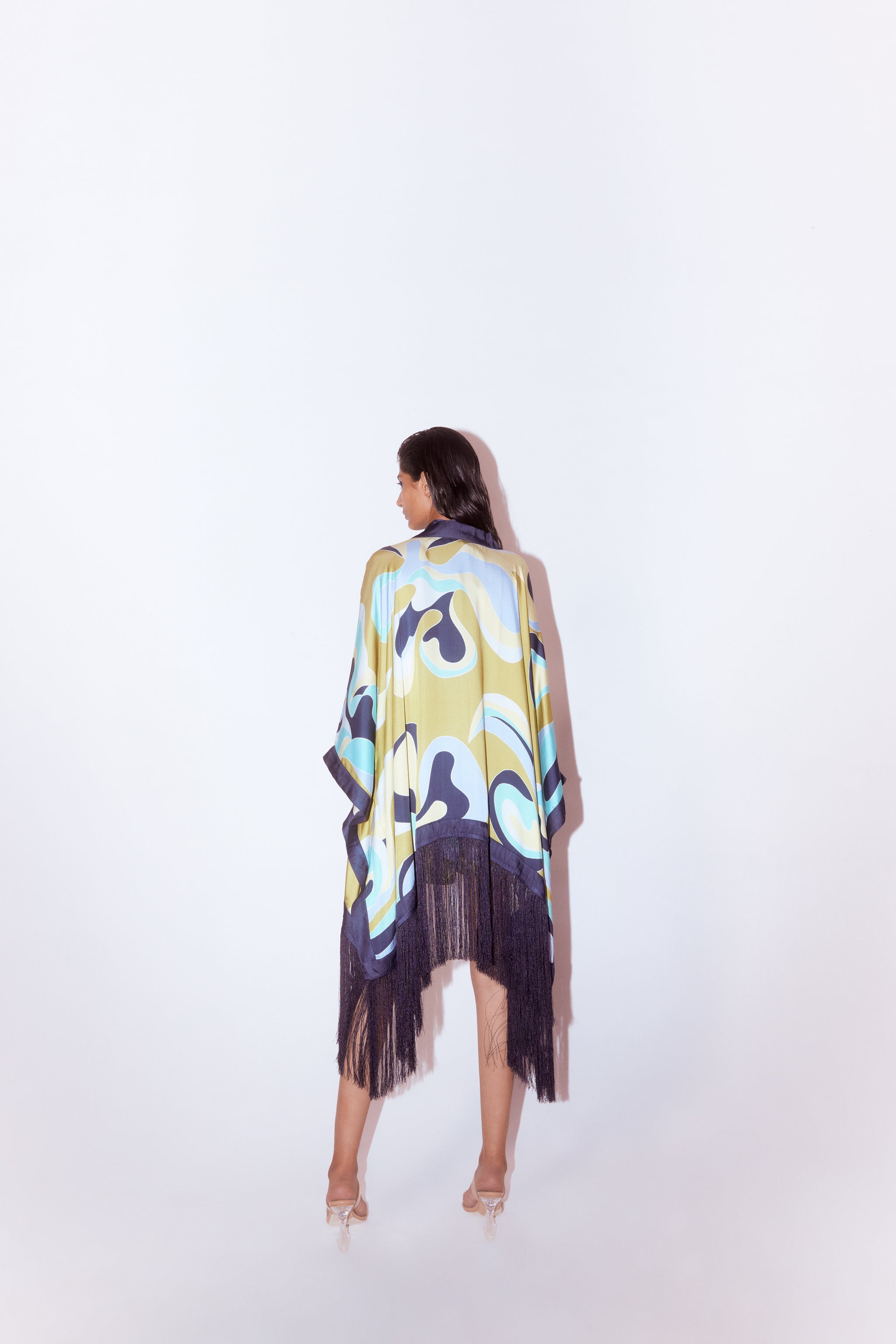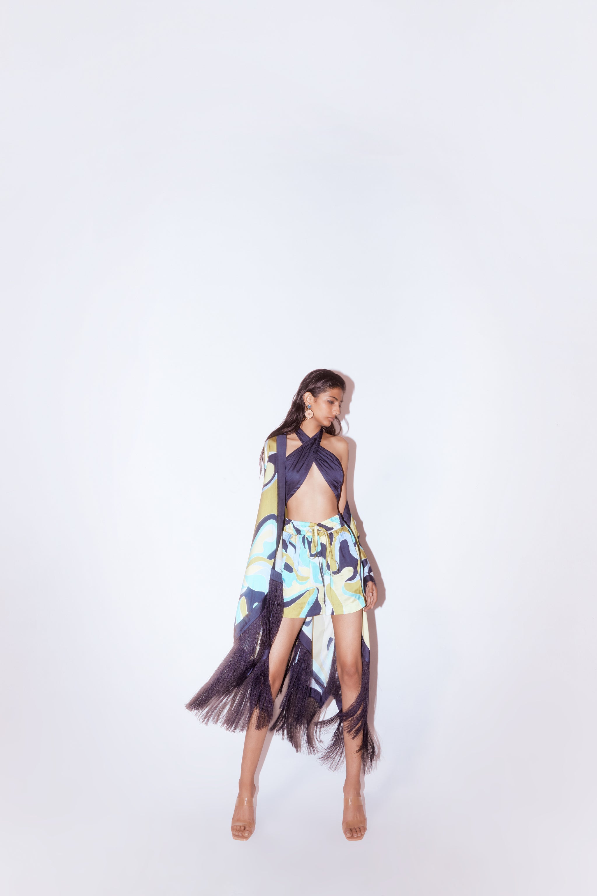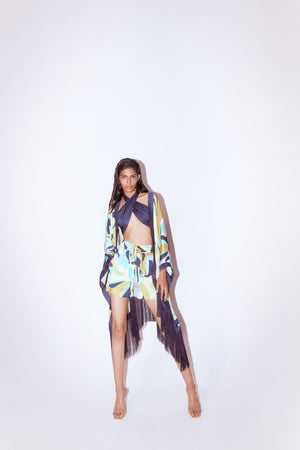 • The maple kimono, halter top and shorts co-ord crafted from our stunning vegan silk fabrication, trans-seasonal, is a statement piece. Made in our abstract maximalist maple print, this is a trendsetting piece. Featuring a contrasting collar with stylish fringes, the kimono is versatile and can be styled in different ways. The kimono is free size. This piece comes with our maple drawstring shorts with pockets and a contrast halter top for a complete look.
