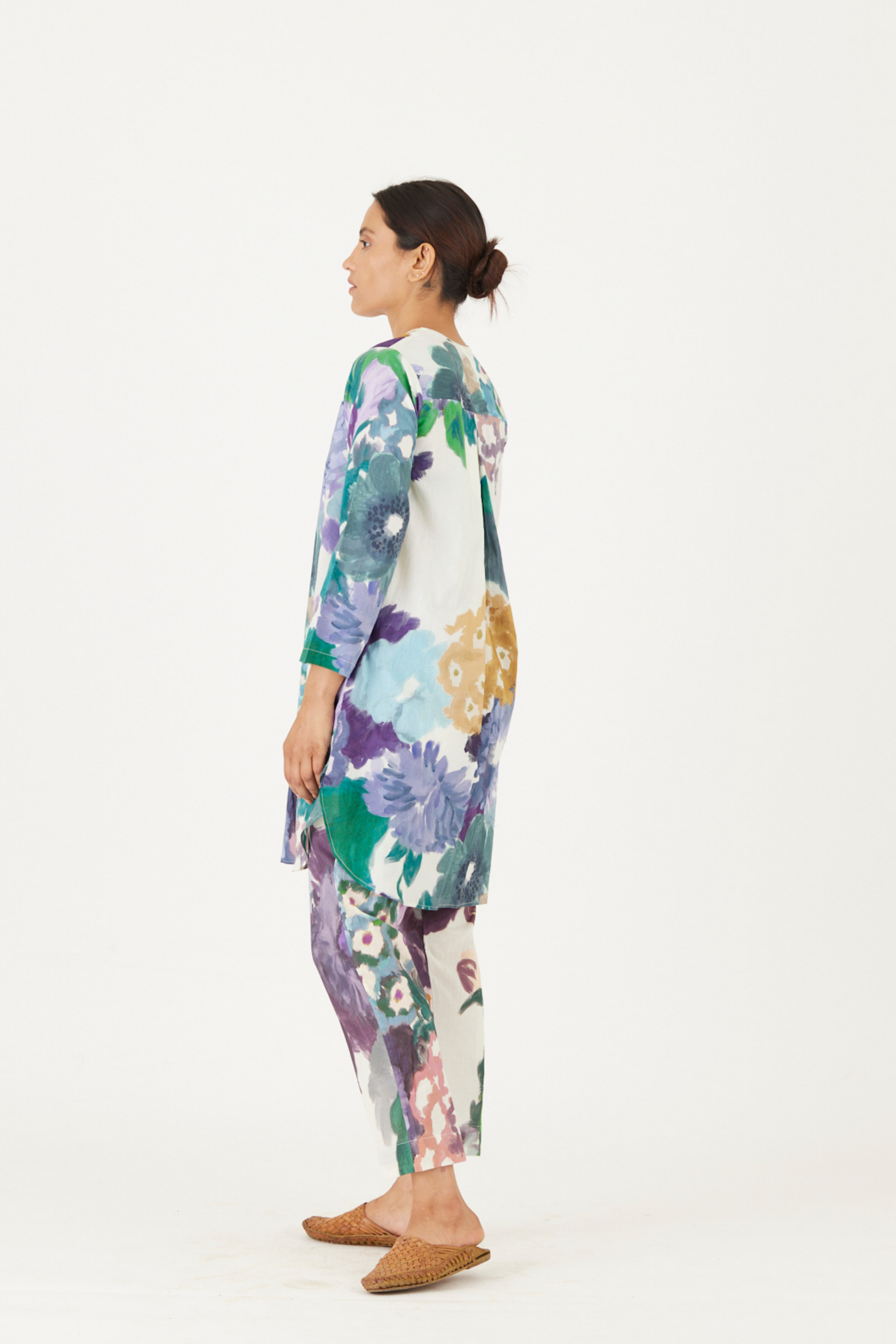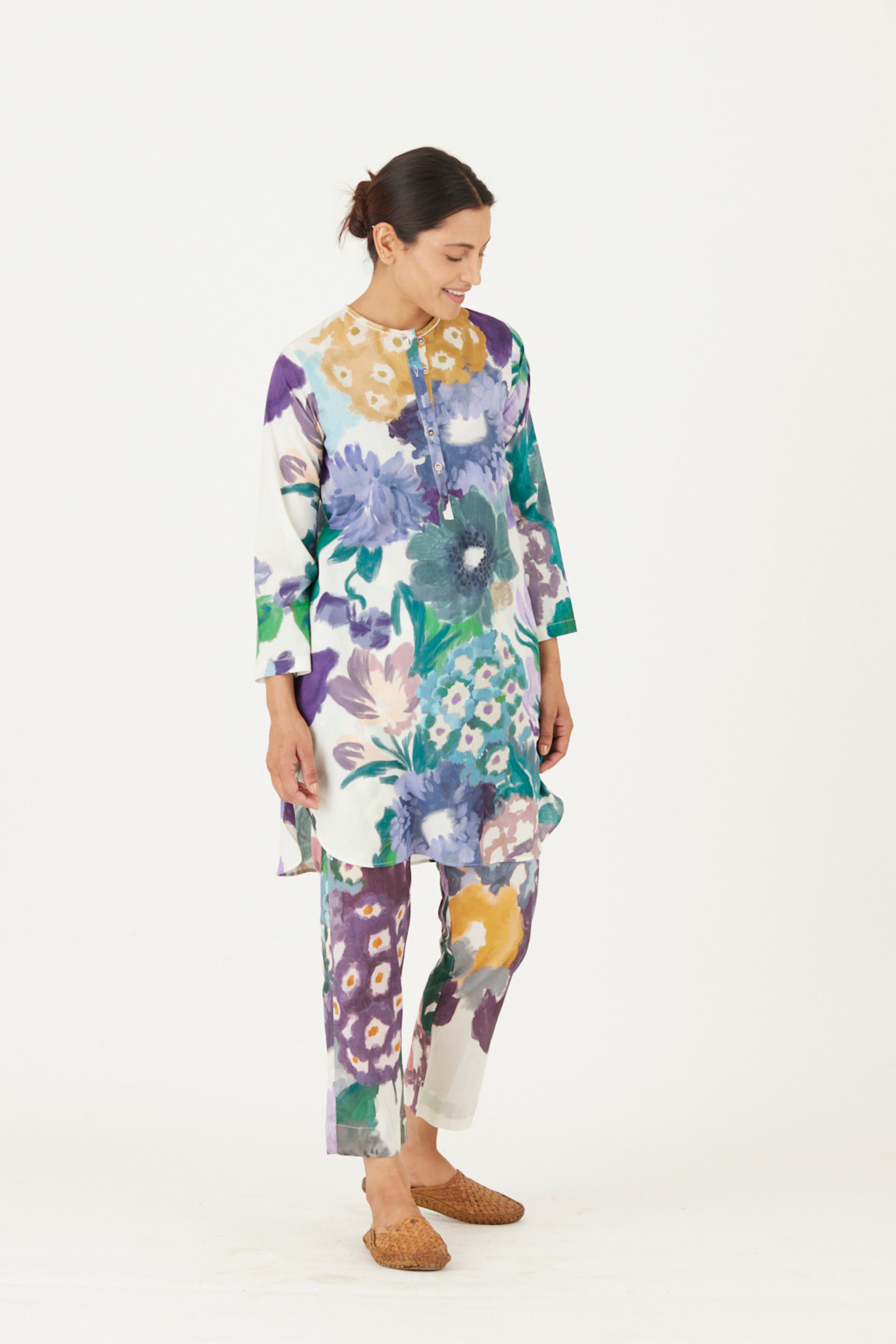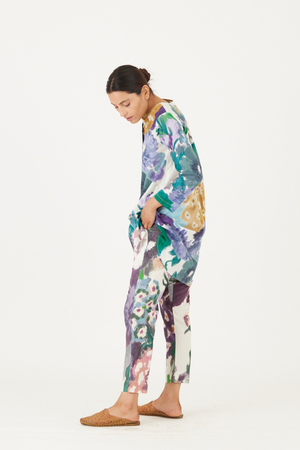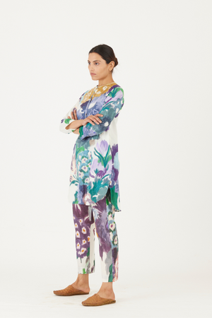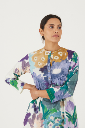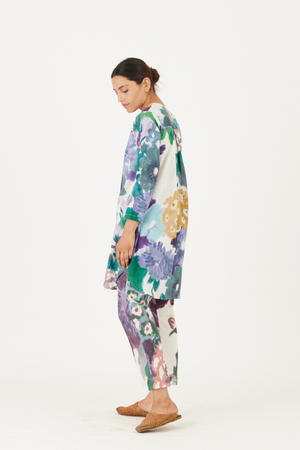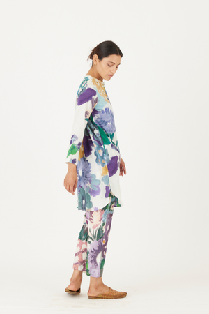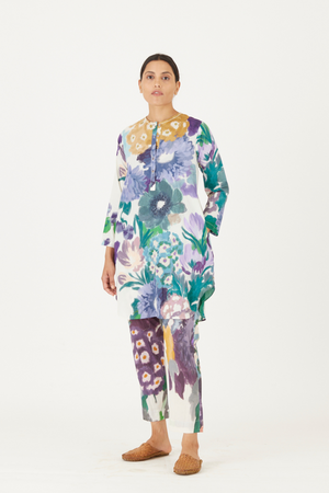 • The print features an abundance of roses along with marigolds and jasmines arranged together in a bouquet on a summer white base. The set is crafted in the Farah print carefully printed on cotton. The tunic has a hand block printed striped lining. The set includes a tunic and pants.