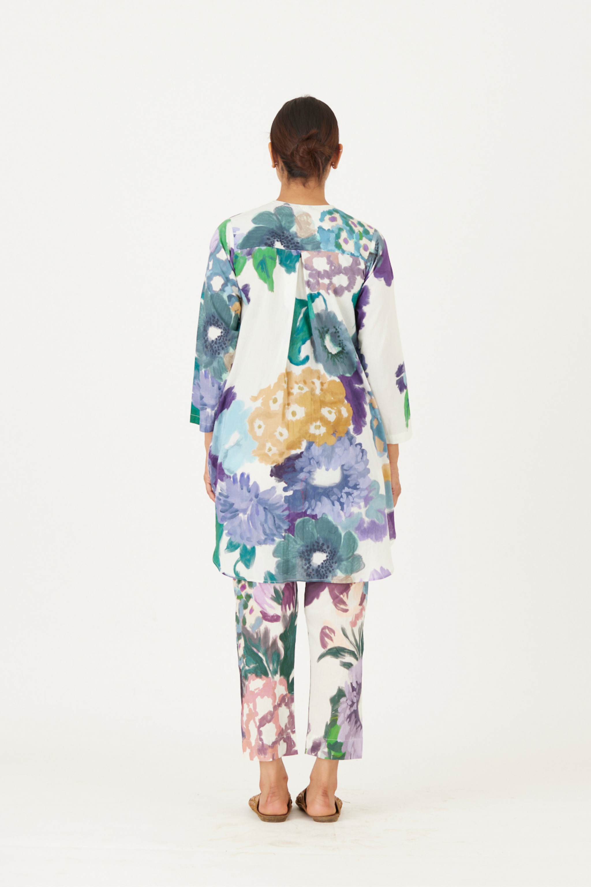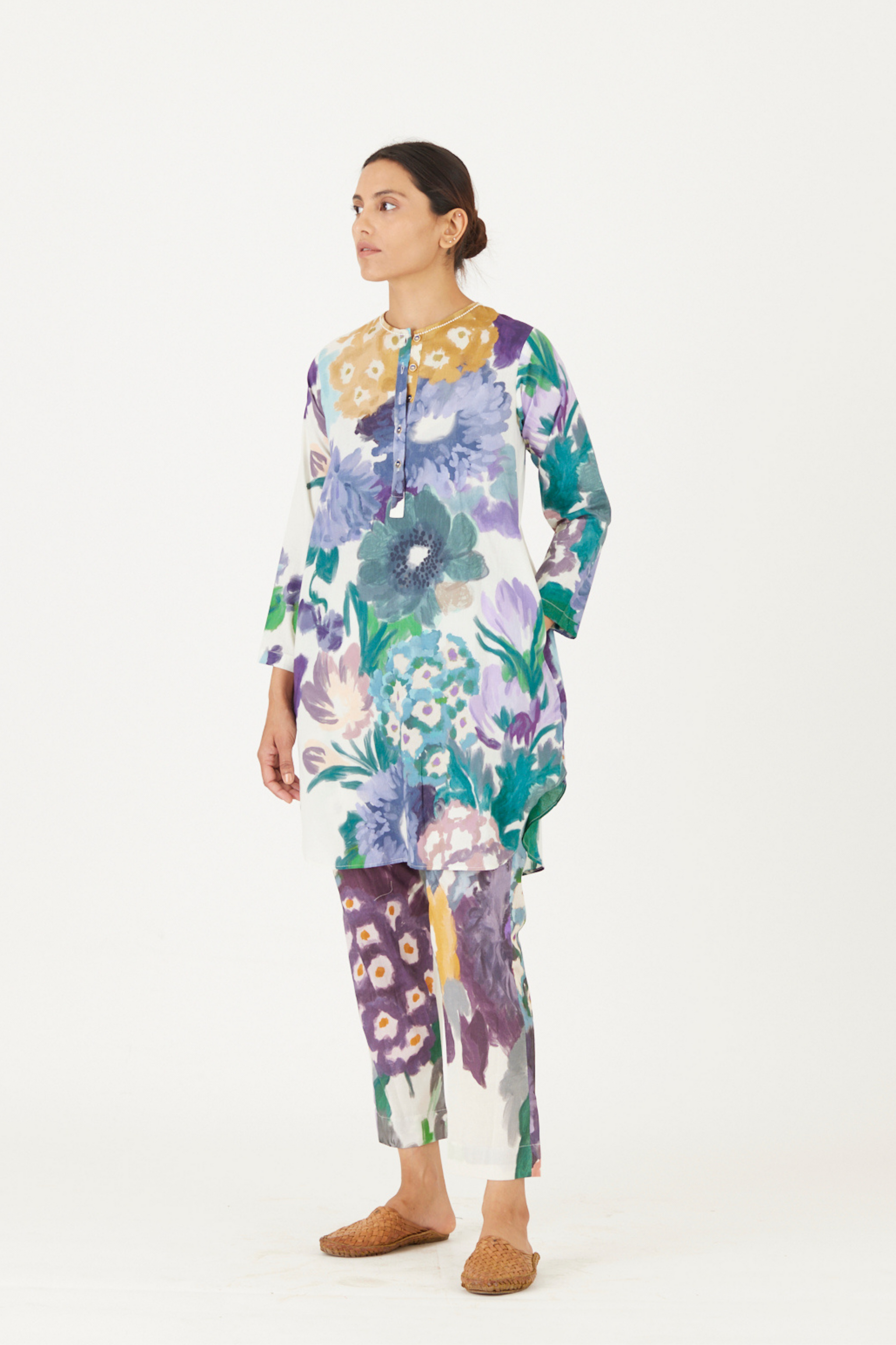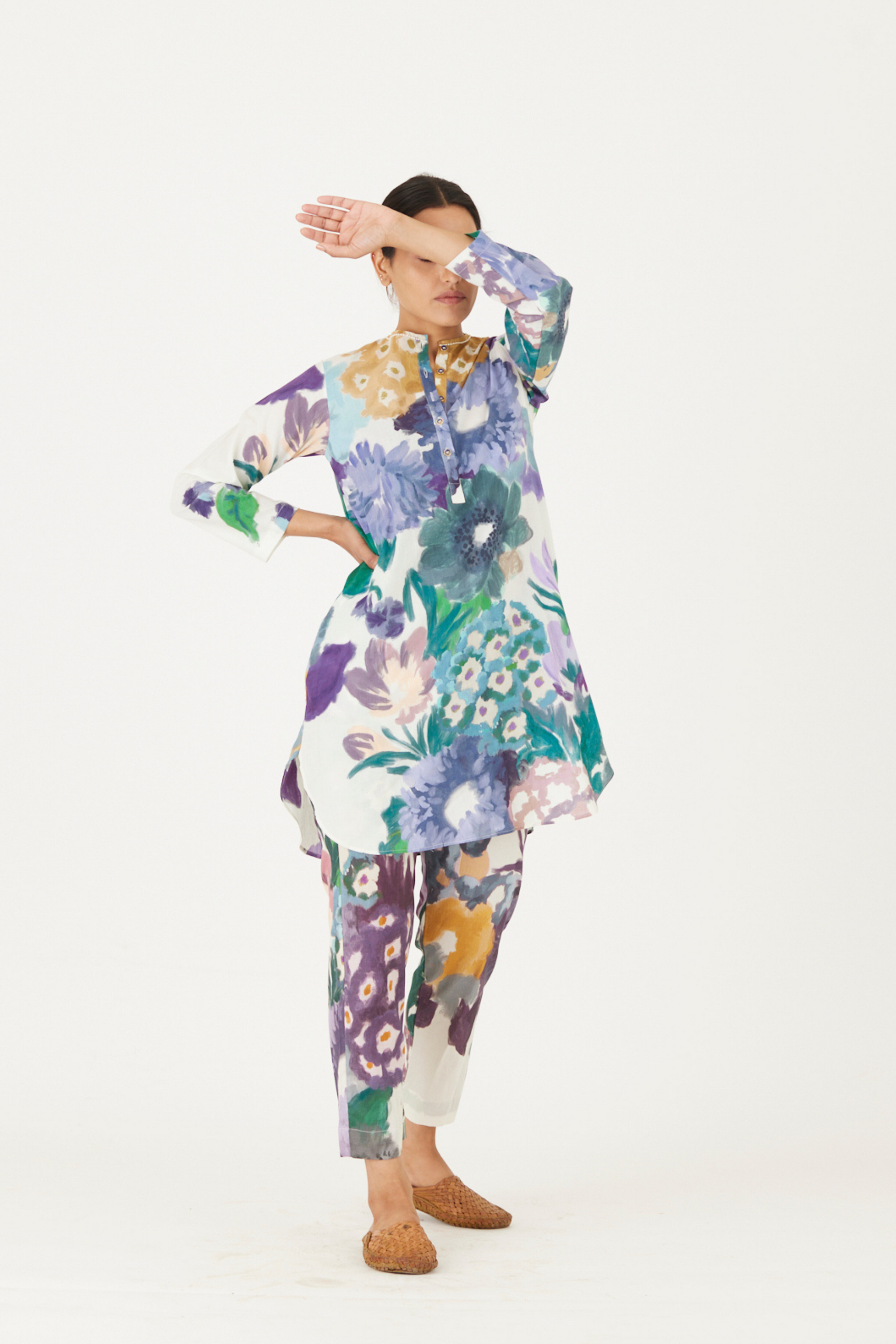 • The print features an abundance of roses along with marigolds and jasmines arranged together in a bouquet on a summer white base. The set is crafted in the Farah print carefully printed on cotton. The tunic has a hand block printed striped lining. The set includes a tunic and pants.