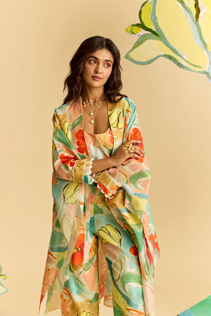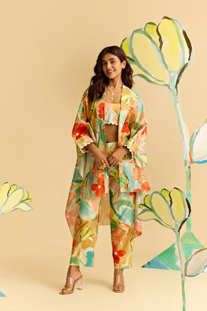 • Mint multicoloured printed high-low cape and bustier paired with pants