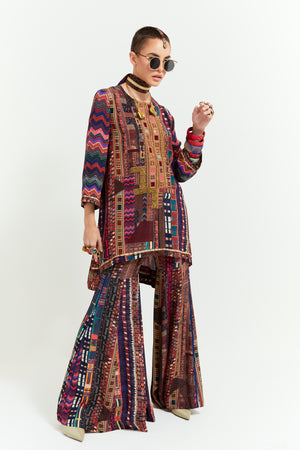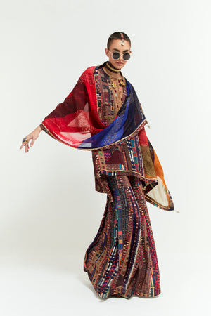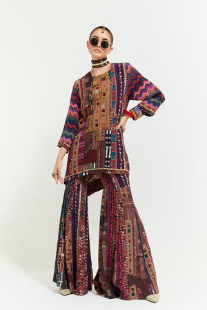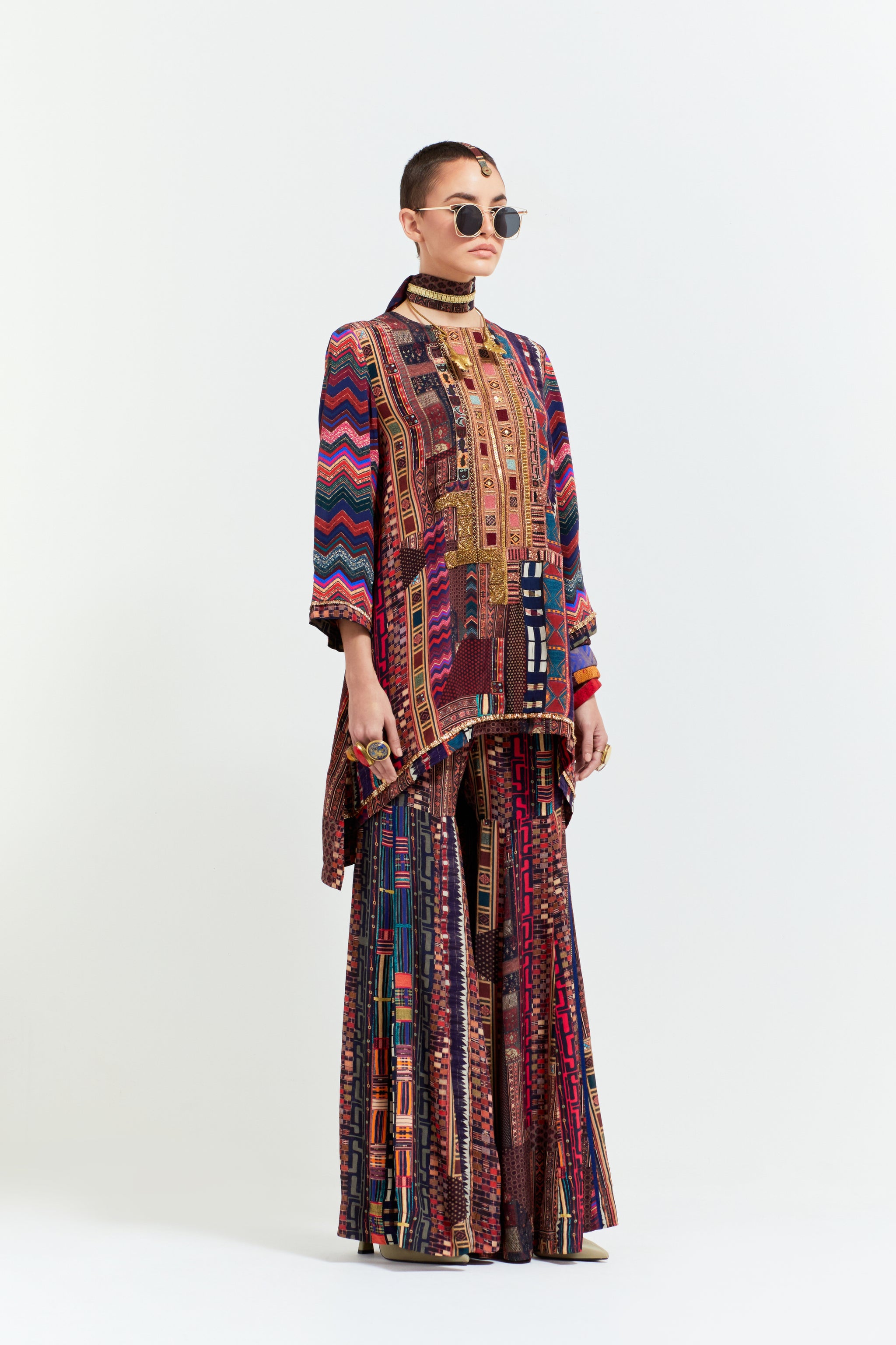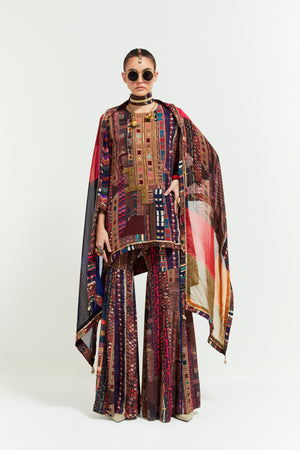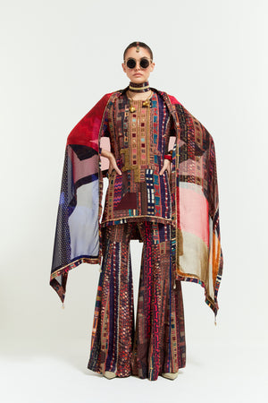 • Relaxed fit short printed kurti with printed inserts paired with draped trouser and sheer silk dupatta. Resham thread embroidery, cowri shells, m.O.P. Bead and tassel details. Fit - Easy fit kurta with elasticated draped trouser and dupatta. Note - Slight variation in print Kurti Length-front-28" Back-32" trouser Length- 42" dupatta- 98" X 35"
