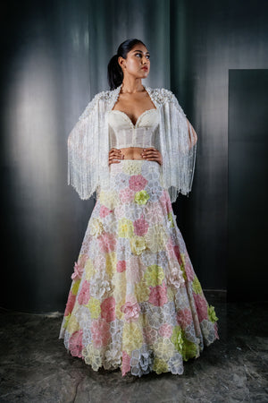 • This multi colour floral skirt set features a bridal skirt with extensive floral embroidery and 3d flowers to elevate the look. It is paired with a pearl corset top in a tulle base and a fringe cape with stunning paillettes detailing.